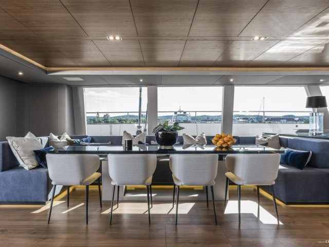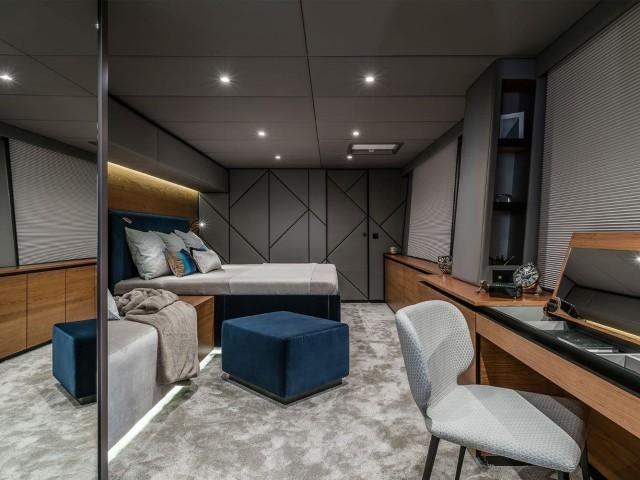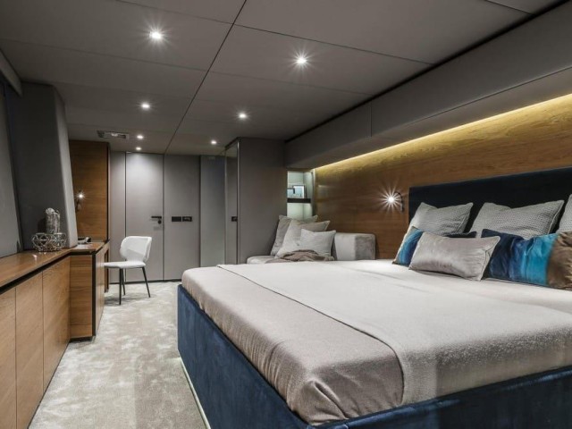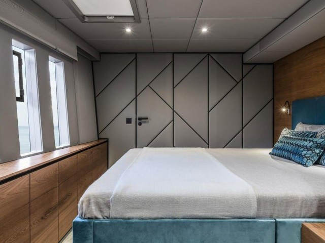 7X bietet bequem Platz für bis zu acht Gäste in vier opulenten Kabinen. Die Eignersuite befindet sich im Steuerbordrumpf und verfügt über ein großzügiges Layout mit eigenem Bad, während die drei VIP-Kabinen, alle mit eigenem Bad, exquisiten Komfort bieten. Die edle Innenausstattung mit hochwertigen Details aus Teakholz, gesintertem Quarz und Onyx mit metallischen Akzenten vereint Schönheit und Funktionalität.