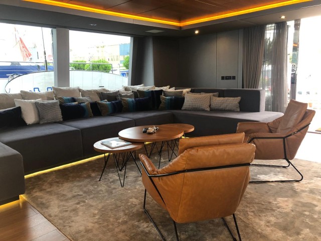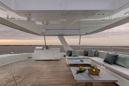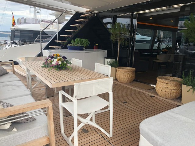Zu den Unterhaltungsmöglichkeiten an Bord gehören ein Bose-Musiksystem, ein Smart-TV und WLAN. Draußen bietet die spektakuläre Flybridge mit Sonnenliegen, einer Wet-Bar und zwei Steuerständen den idealen Rahmen für ein Essen im Freien. Eine hydraulische Badeplattform erweitert das Achterdeck und schafft zusätzlichen Platz zum Entspannen direkt am Wasser.