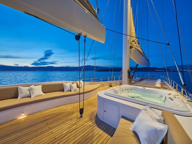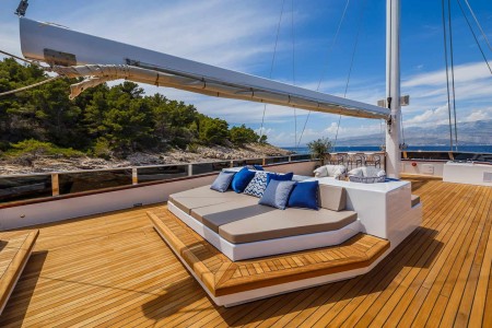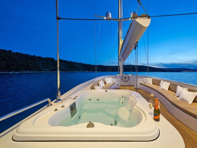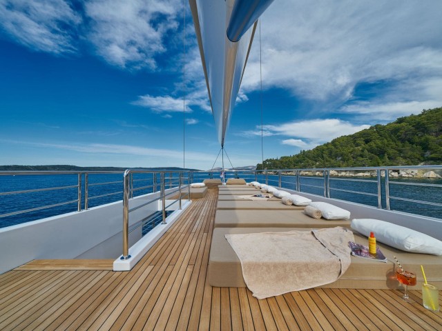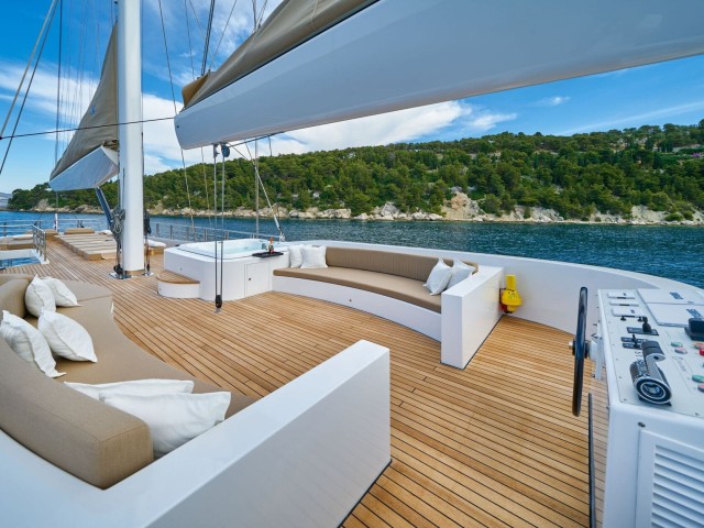 Die Decks von Acapella sind für Entspannung und Unterhaltung ausgelegt. Das Oberdeck verfügt über eine geräumige Sonnenliegefläche, einen schattigen Esstisch für unvergessliche Mahlzeiten im Freien und einen luxuriösen runden Whirlpool. Eine anpassungsfähige Einrichtung bietet viel Platz für morgendliches Yoga oder gesellige Zusammenkünfte mit Panoramablick, während ein offener Loungebereich die Gäste zum Entspannen einlädt, während sie entlang der Küste segeln.