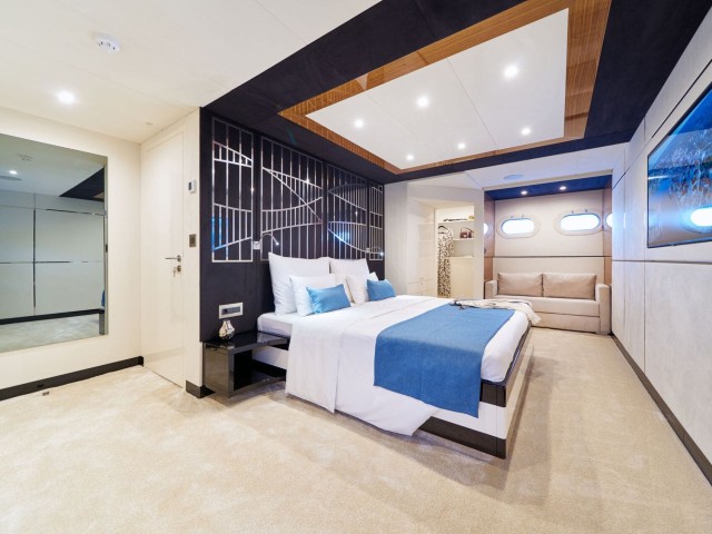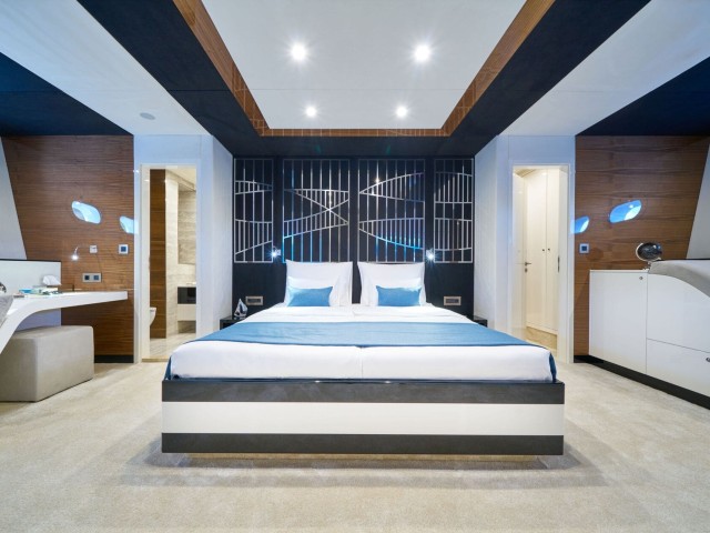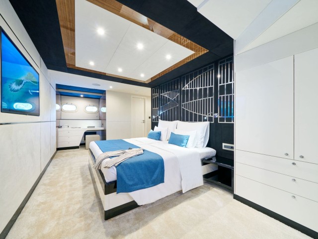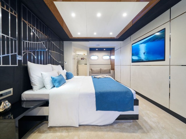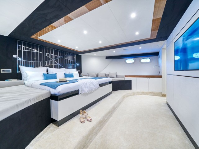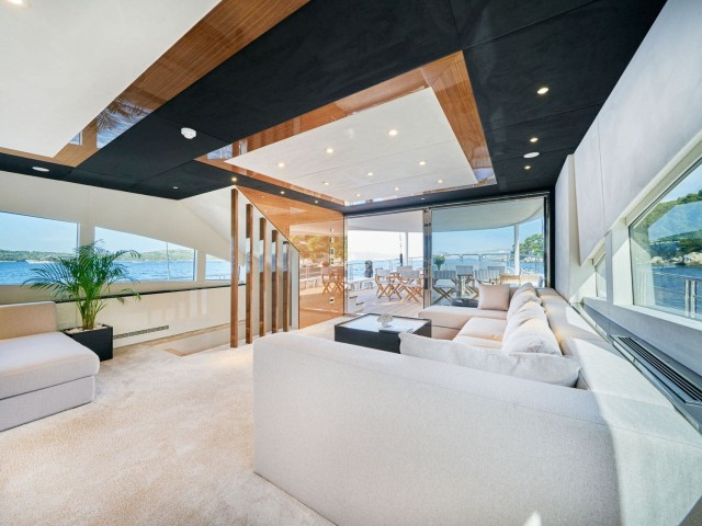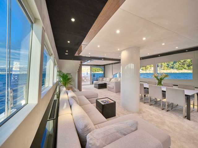 Im Inneren bietet das elegante, Zen-inspirierte Interieur von Acapella einen ruhigen Raum, der durch raumhohe Fenster in natürliches Licht getaucht wird. Der Hauptsalon verfügt über bequeme Sitzgelegenheiten, einen formellen Essbereich und eine stilvolle Bar, die eine Atmosphäre eleganter Ruhe schaffen. Erstklassige Annehmlichkeiten wie Satellitenfernsehen, WLAN und ein ausgeklügeltes Soundsystem tragen zum Komfort und zur Bequemlichkeit an Bord bei.