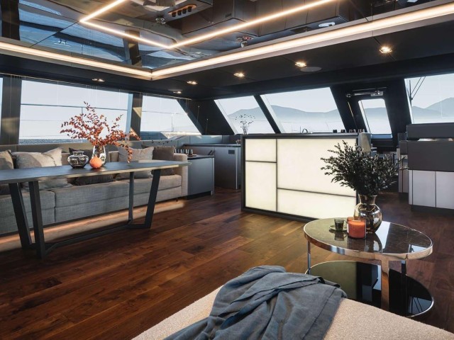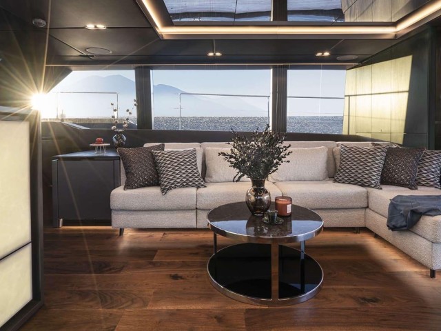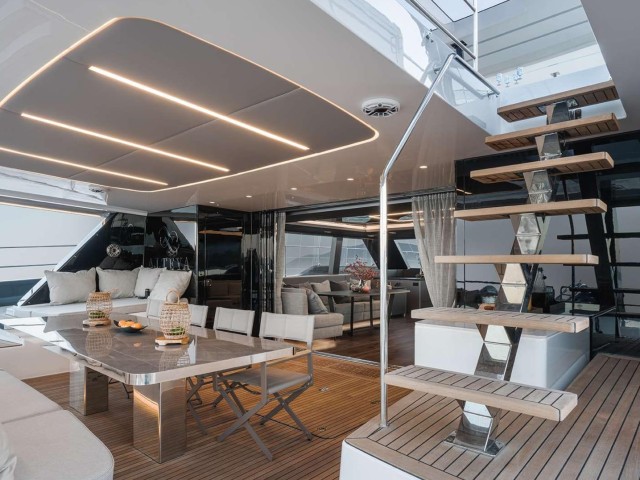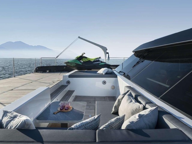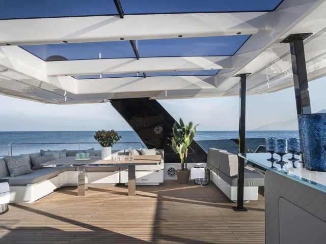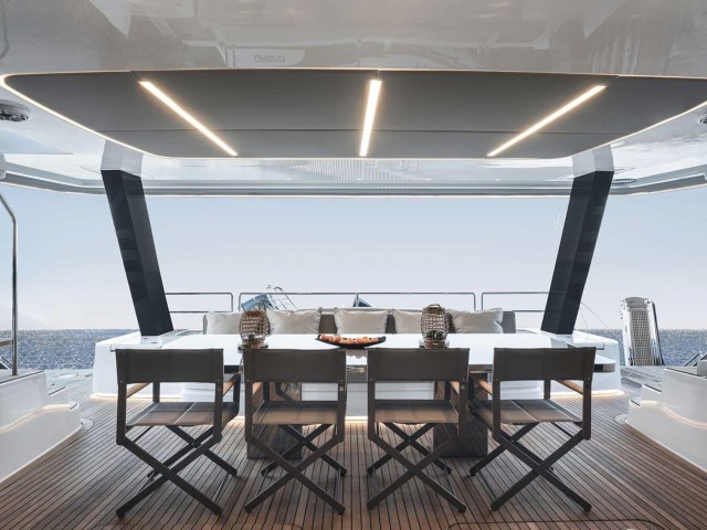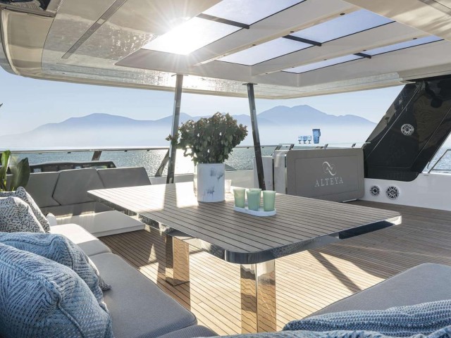 Alteya wurde für ultimative Entspannung entworfen und bietet drei verschiedene Außenbereiche, die perfekt für Sonnenanbeter oder Gäste sind, die den Schatten genießen möchten. Die großzügige Flybridge ist das ultimative Refugium mit einer voll ausgestatteten Bar, einem Essbereich im Freien und großzügigen Sonnenliegen. Auf dem Vordeck lädt eine komfortable Lounge mit eleganten Sitzmöglichkeiten und einem geschützten Bereich zum Verweilen ein. Der Heckbereich bietet eine stilvolle Sitzecke mit direktem Zugang zu den Wassersportaktivitäten sowie einen idealen Ort für gesellige Momente und Mahlzeiten unter freiem Himmel.