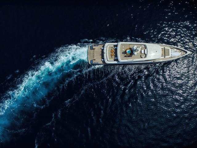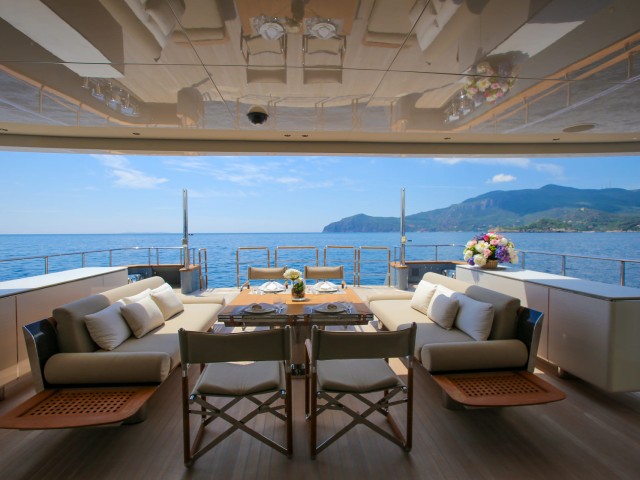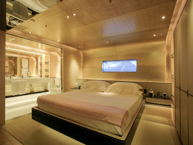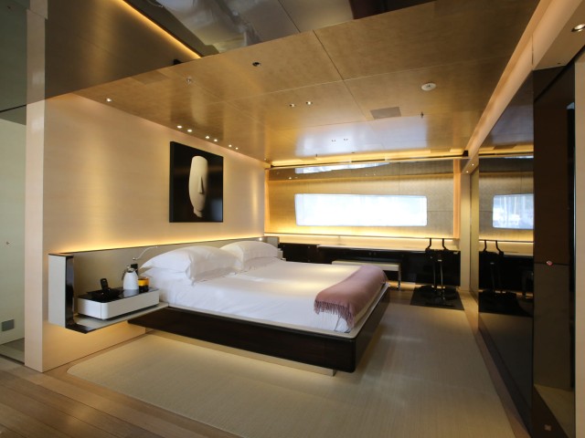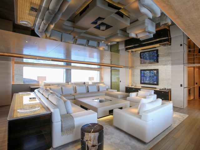 Beim Betreten der Yacht werden die Gäste von einem bemerkenswerten 70 Quadratmeter großen Achterdeck empfangen, das den Ton für das großzügige Raumgefühl der Yacht angibt. Im Inneren verbindet das von Rémi Tessier entworfene Interieur frischen, modernen Stil mit luxuriösen Details. Edle Materialien wie Karbonfaser, schwarzes Chrom und Akzente aus Blattgold verbinden sich mit hellen Hölzern und raffinierten Texturen und schaffen eine warme, zeitgemäße Atmosphäre auf der gesamten Yacht.