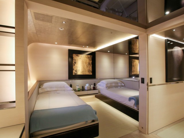 Aslec 4 bietet Platz für bis zu 10 Gäste in fünf wunderschön eingerichteten Kabinen. Die Master-Suite über die gesamte Breite des Schiffes bietet einen ruhigen Rückzugsort, ergänzt durch zwei VIP-Suiten und zwei Zweibettkabinen. Eine der Zweibettkabinen verfügt über eine Pullman-Koje, die für ein kleines Kind unter zwei Jahren geeignet ist. Jede Kabine ist auf höchstem Niveau ausgestattet und verfügt über ein eigenes Bad und moderne Unterhaltungssysteme, um maximalen Komfort zu gewährleisten.