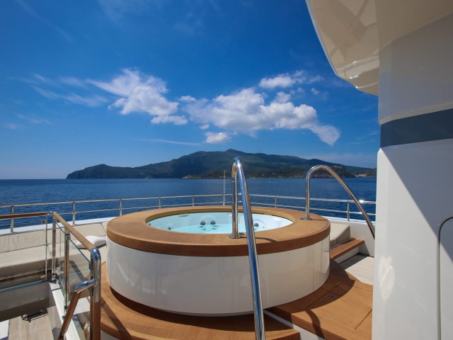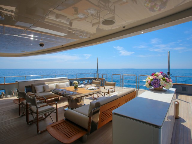 Das Sonnendeck der Aslec 4 ist ein Highlight mit einem großen Whirlpool, der von einer großzügigen Liegefläche umgeben ist – ideal, um die mediterrane Sonne zu genießen oder einen entspannten Abend unter dem Sternenhimmel zu verbringen. Al-Fresco-Dining und ein Teppanyaki-Grill ermöglichen es den Gästen, köstliche Mahlzeiten im Freien zu genießen, was das vielseitige und luxuriöse Lifestyle-Angebot der Yacht abrundet.