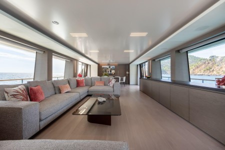 Ein wunderbares Mittagessen mit wohltuendem Schatten kann auf dem Achterdeck eingenommen werden, das einen einfachen Zugang zum prächtigen Salon ermöglicht, dessen große, vom Boden bis zur Decke reichende Fenster den Panoramablick als zusätzliche Dekoration zulassen. Mit den luxuriösesten Möbeln in sanften, zurückhaltenden Tönen lockt er zu einer entspannenden Lektüre, während Sie auf dem üppigen Gainsborough-Sofa faulenzen. Oder warum fordern Sie Ihre Freunde nicht zu einer intelligenten Schachpartie heraus? Eine Marmorbar sorgt hier für zusätzlichen Charme und gesellige Stunden.