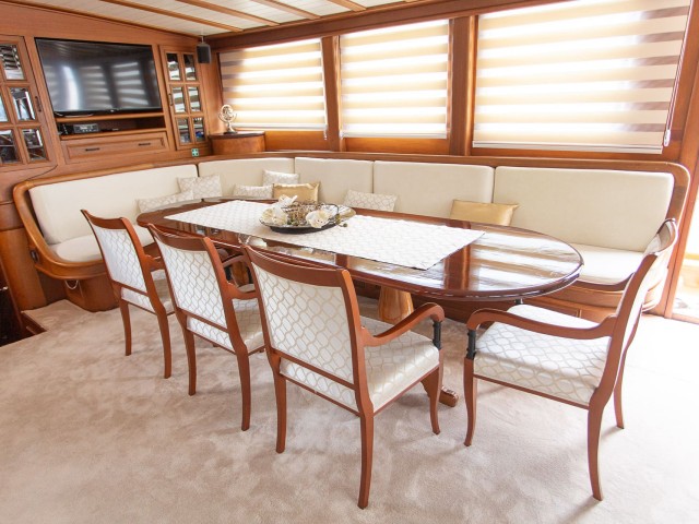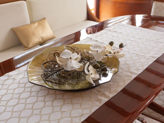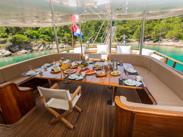 Trocknen Sie sich auf den Sonnenbänken am Bug ab, und machen Sie sich dann bereit für ein herrliches Essen, das auf dem schattigen Achterdeck serviert wird, das mit einem flexiblen Tisch für Mahlzeiten im Freien mit Ihrer sorgfältig ausgewählten Entourage aufwartet. Erstklassiger Service, sichere Fahrten und eine sorgenfreie Reise werden von ihrer unglaublichen Crew aus 5 außergewöhnlichen Marineprofis geboten.