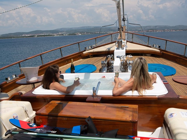 Wählen Sie eines der vielen Wasserspielzeuge, die von Dolce Vita zur Verfügung gestellt werden, um Ihrem Erlebnis an Bord einen Adrenalinschub zu verleihen, oder gehen Sie eine Runde in den glitzernden dalmatinischen Gewässern schwimmen. Faulenzen Sie auf den beigefarbenen Polstern am Heck oder gehen Sie näher an den Bug, um sich im Jacuzzi-Bad verwöhnen zu lassen, während Sie die weite Aussicht bewundern können. Auf jeder Seite finden Sie zwei kleine Tische, an denen Sie Ihr Getränk abstellen können. Stellen Sie sich vor, wie Sie hier Sonnenuntergänge erleben - nicht umsonst wurde diese Superyacht Dolce Vita genannt.