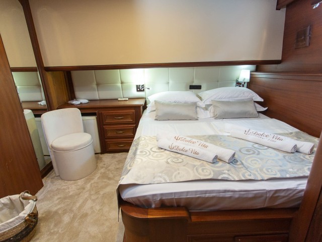 Ihr intelligentes Layout bietet Platz für bis zu 10 Gäste in 5 spektakulären Kabinen, wobei 4 Doppel- und 1 Zweibettzimmer für erholsame Nächte vor Anker zur Verfügung stehen. Alle Kabinen sind mit hochwertigen Badezimmern, Klimaanlagen, erstklassigen Annehmlichkeiten und Flachbildfernsehern ausgestattet und bieten so den gewohnten Komfort und noch mehr. Die gemütliche Atmosphäre wird durch die reichliche Verwendung von hochwertigem Holz unterstrichen, wodurch eine zeitlose Ästhetik entsteht, die alle Reisenden während ihres Aufenthalts auf der Dolce Vita genießen können.