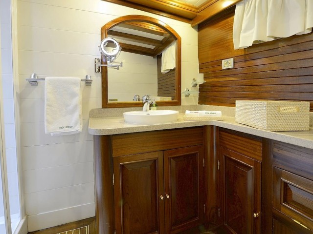 Ecce Navigo kann bis zu 10 Gäste in 5 anspruchsvollen Kabinen unterbringen, in denen eine Fülle von edlem Naturholz eine beruhigende Atmosphäre für erholsame Nächte vor Anker schafft. Die Master-Suite verfügt über einen Flachbildfernseher und eine üppige Couch für diejenigen, die gerne vor dem Schlafengehen noch eine Sendung sehen, sowie ein stilvolles eigenes Bad mit zwei Waschbecken. Familien mit kleinen Kindern werden die Zweibettkabinen mit einem Doppelbett neben einem Einzelbett lieben, mit einem Arbeitstisch, an dem die Kleinen vor Schulbeginn lernen können oder Sie Ihre E-Mails aufholen können.