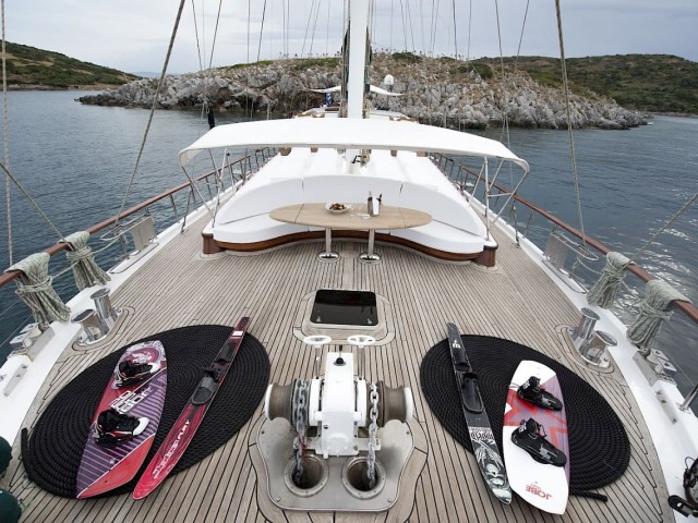 Während einem Badestopp in der glitzernden See, können Sie eines der zahlreichen Wasserspielzeuge der Ecce Navigo nutzen, die Spaß beim Plantschen mit Ihrer Begleitung garantieren. Abtrocknen können Sie sich auf dem Sonnendeck, wo Sie 8 Sonnenpads finden, die perfekt für Sonnenanbeter sind, die sich eine bronzene Bräune zulegen wollen, während sie auf dem offenen Meer entspannen.