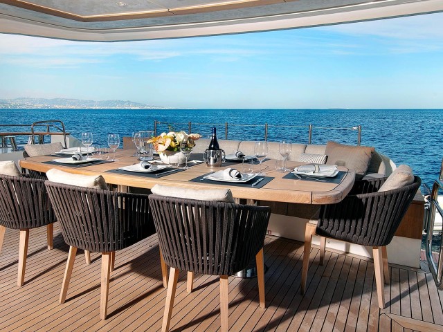 Gehen Sie auf die Flybridge, um sich verwöhnen zu lassen - hier finden Sie einen einladenden großen Whirlpool, perfekt zum Entspannen und zum Nippen an Cocktails, die an der nahe gelegenen Bar zubereitet werden. Weitere Essgelegenheiten sind hier zu finden, damit die Chartergäste experimentieren und ihre perfekte Umgebung für gemeinsame Mahlzeiten und den Austausch von Gedanken finden können.
