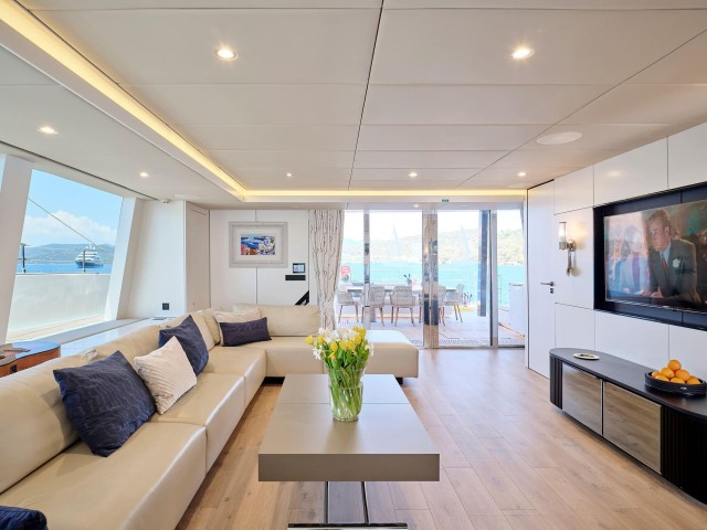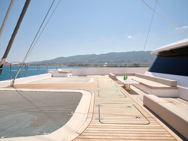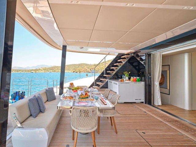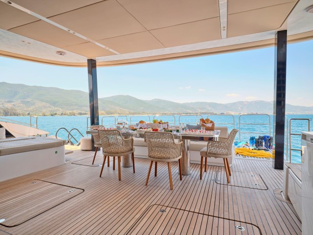 Gennys weitläufige Decksflächen bieten die perfekte Kulisse für atemberaubende Momente auf dem Meer. Die Flybridge ist ein einladender Rückzugsort zum Sonnenbaden, für gesellige Stunden oder zum Genuss von Cocktails bei Sonnenuntergang, während der Essbereich im Freien auf dem Achterdeck die perfekte Kulisse für die vom Bordkoch zubereiteten Gourmetgerichte bietet. Die hydraulische Badeplattform ermöglicht einen mühelosen Zugang zum Wasser und macht jedes Bad zu einem Erlebnis für sich.