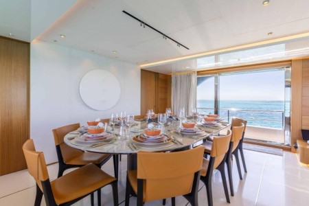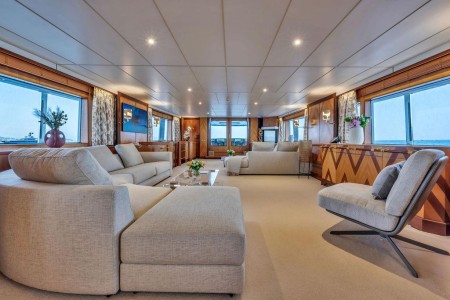 Der Hauptsalon beeindruckt mit seinem offenen Design und stilvoller Einrichtung. Ein voll ausgestatteter Barbereich lädt die Gäste direkt beim Betreten ein, während die gemütliche Sitzecke mit einem großen, umlaufenden Sofa der perfekte Ort ist, um sich zu entspannen oder einen Film auf dem großen Flachbildfernseher zu genießen. Der formelle Speisesaal bietet Platz für besondere Dinner-Events. Auf dem Brückendeck lädt der Sky-Lounge-Bereich mit einem Spieltisch, einer Karaoke-Anlage und einem weiteren großen Fernseher zu geselligen Abenden ein.