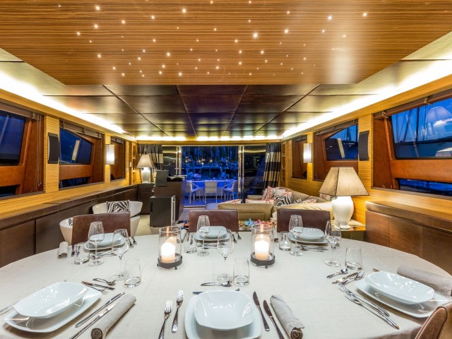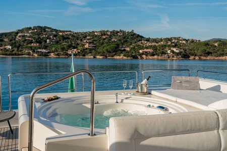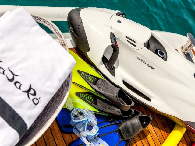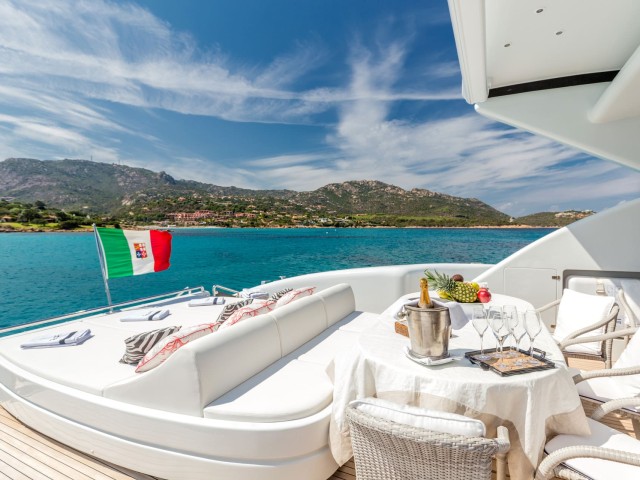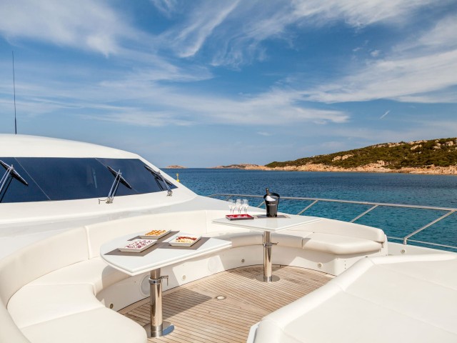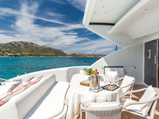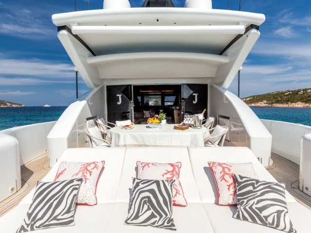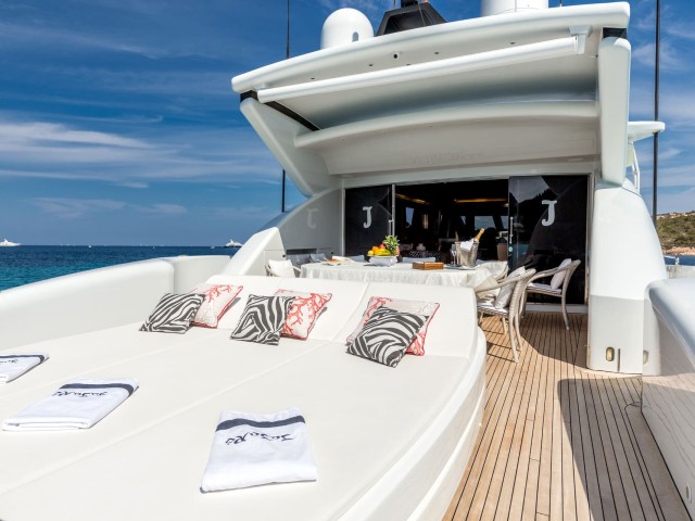 Die Außenbereiche von Jajarò sind für maximalen Genuss unter freiem Himmel gestaltet. Der Bug bietet eine gemütliche Sitzgruppe mit einem Sofa und Sonnenliegen, perfekt, um die mediterrane Sonne zu genießen. Das Achterdeck verfügt über einen großen Esstisch, ideal für Mahlzeiten im Freien mit herrlichem Ausblick. Die Badeplattform sorgt für einfachen Zugang zum Meer und beherbergt einen Stauraum mit einem Beiboot, Wasserspielzeug und Tauchausrüstung, um Spaß und Abenteuer für alle Gäste zu garantieren.