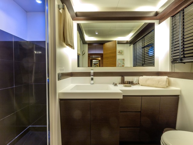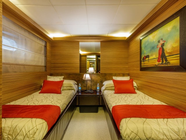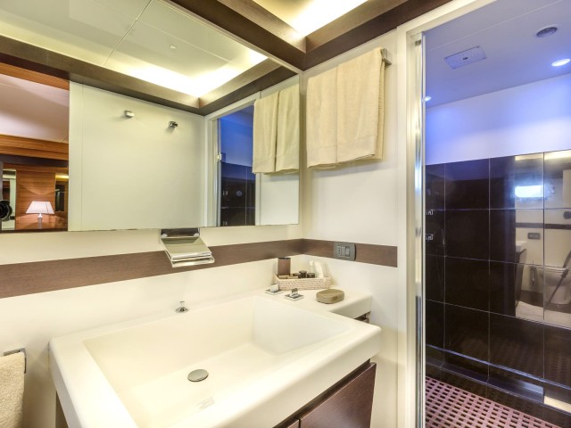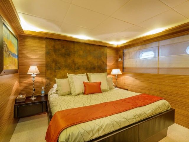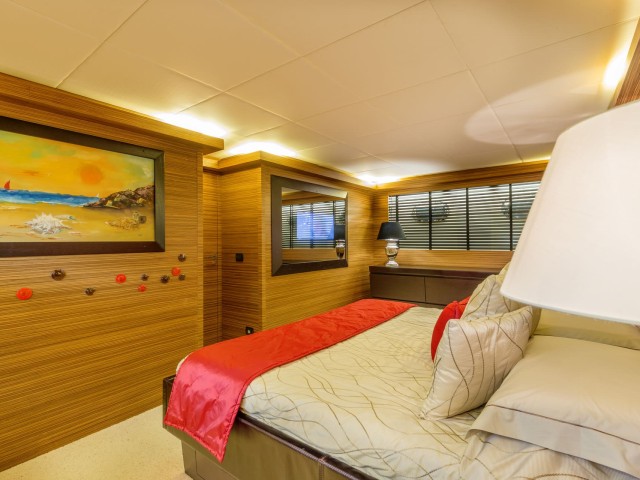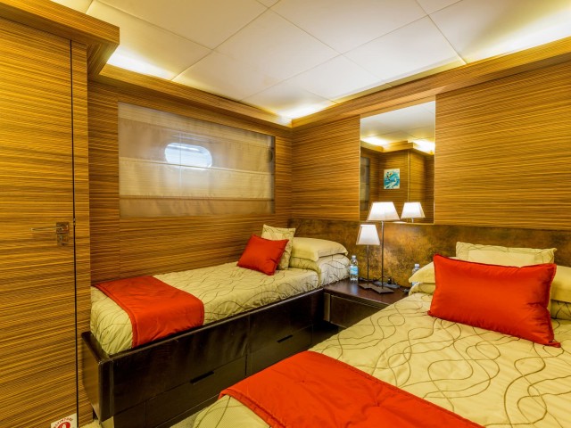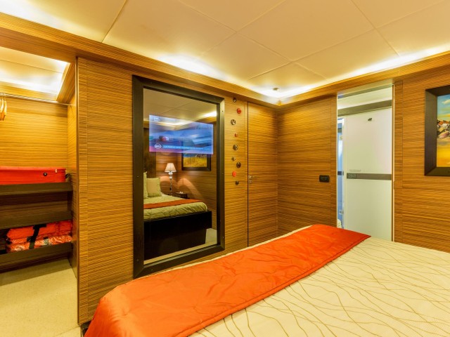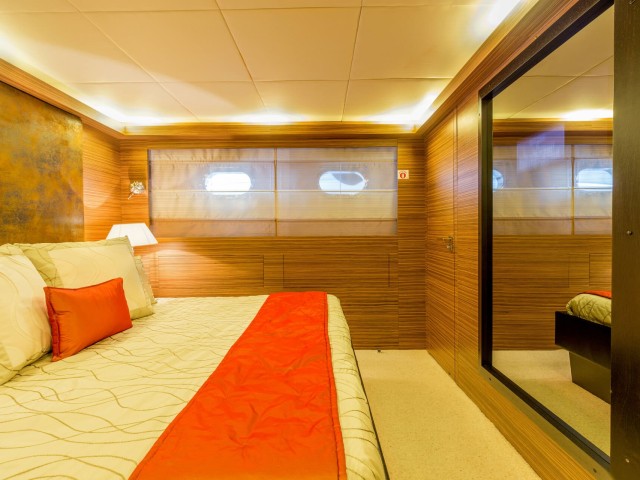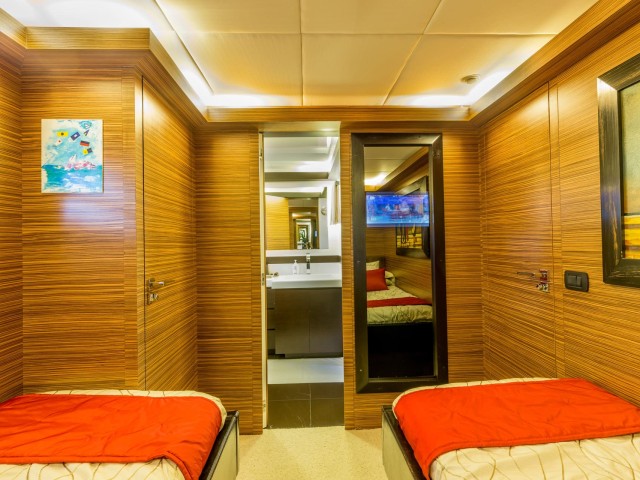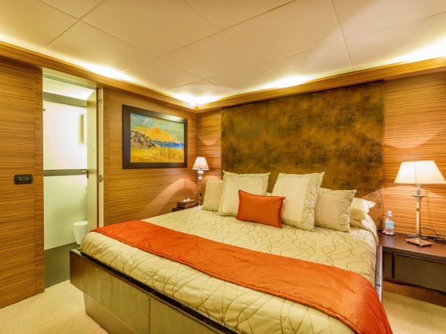 Jajarò bietet ein durchdachtes Layout mit 4 elegant gestalteten Kabinen, die Komfort und Privatsphäre gewährleisten. Die Hauptsuite, die sich über die gesamte Breite des Hecks erstreckt, verfügt über einen begehbaren Kleiderschrank und ein luxuriöses eigenes Badezimmer. Die VIP-Kabine im Bug bietet großzügigen Platz und ein eigenes Badezimmer. Zwei Doppelkabinen, die sich im mittleren Bereich des Bootes befinden, verfügen ebenfalls über eigene Badezimmer und eignen sich perfekt für Familien oder Freunde. Jede Kabine ist mit einem LCD-TV und SKY-Satellitenkanälen ausgestattet, um während Ihres Aufenthalts für Unterhaltung zu sorgen.