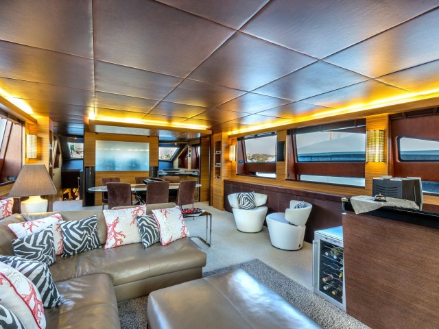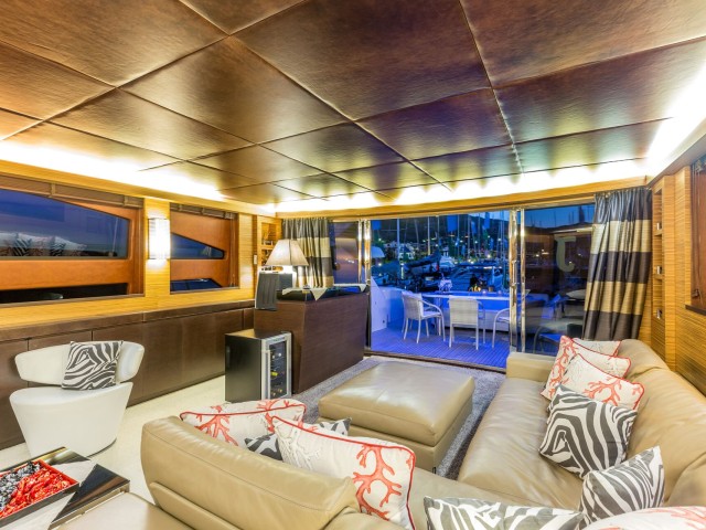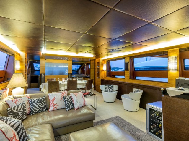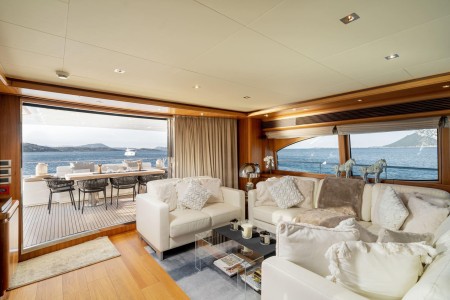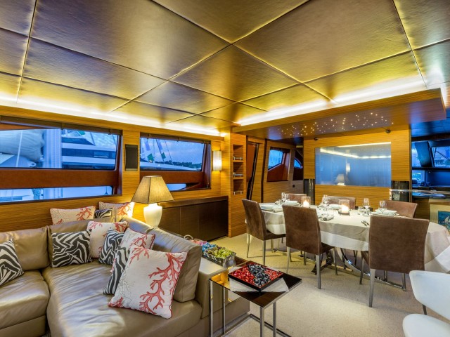Das Interieur von Jajarò ist modern und dennoch einladend, mit einer raffinierten Kombination aus Holz und Leder, die eine warme und elegante Atmosphäre schafft. Der geräumige Salon verfügt über ein L-förmiges Sofa und einen Esstisch, ideal für gesellige Stunden oder formelle Mahlzeiten. Natürliche Lichtdurchflutung sorgt für ein offenes und einladendes Ambiente, während die Treppe hinter dem Sofa einen bequemen Zugang zu den Kabinen auf der unteren Decksebene bietet.