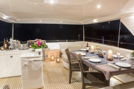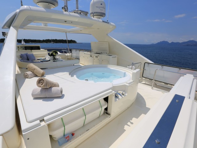 Gönnen Sie sich ein Gourmet-Dinner, das der talentierte Bordkoch auf der Flybridge-Sitzgruppe zubereitet hat, und gönnen Sie sich anschließend ein Bad im Jacuzzi im Freien unter dem Sternenhimmel.