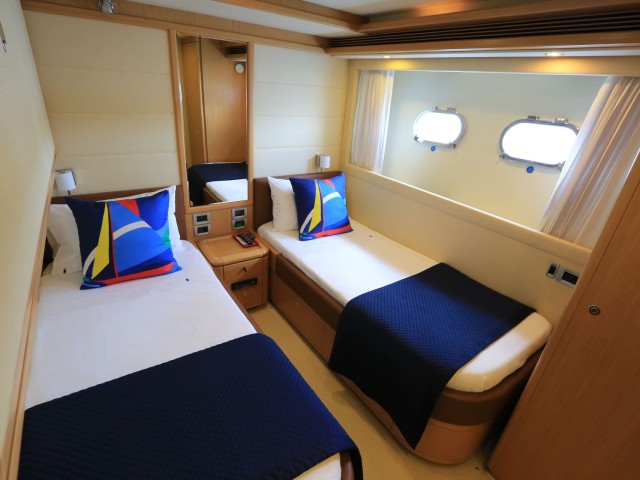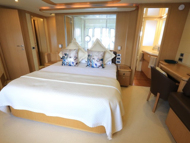 Onyx kann bis zu 10 Gäste für eine Übernachtung in 4 gut ausgestatteten Kabinen willkommen heißen, jede mit einem eigenen Bad. Die Master-Suite ist wahrlich palastartig und erstreckt sich über die gesamte Breite der Yacht. Eine elegante VIP-Suite wird selbst die anspruchsvollsten Chartergäste begeistern, während die beiden Twin-Kabinen mit je einem Pullman-Bett ausgestattet sind, um eine flexible Unterbringung zu ermöglichen.