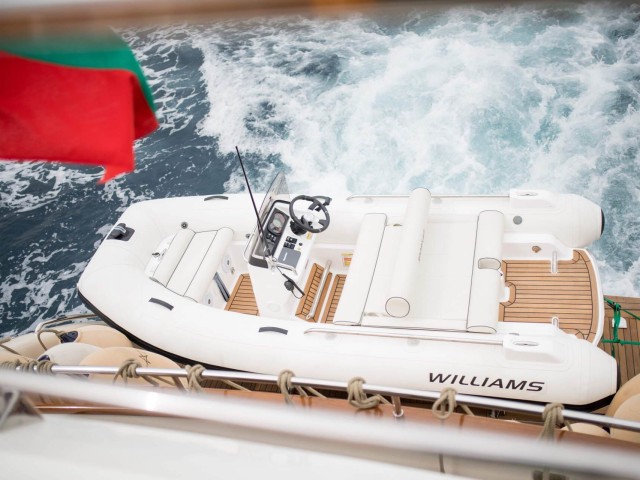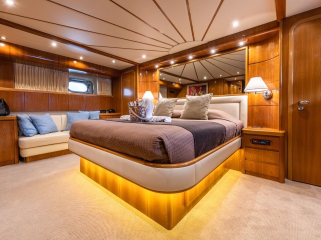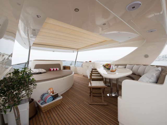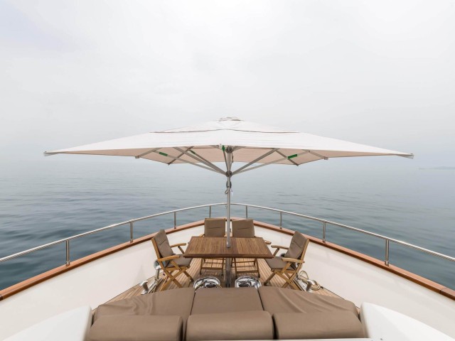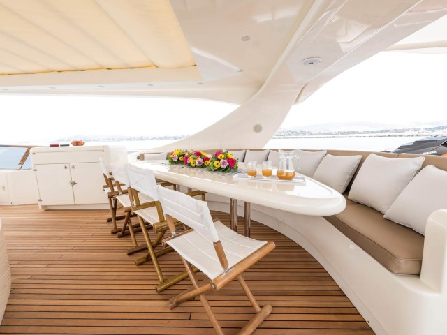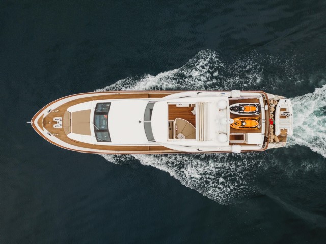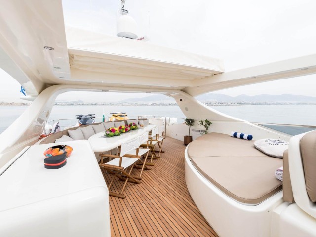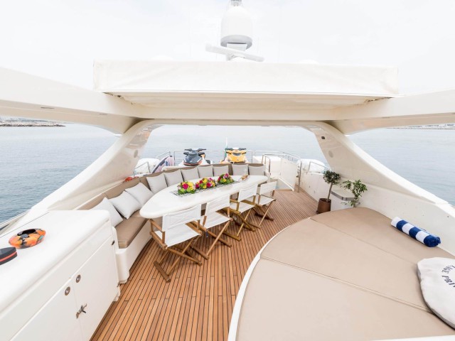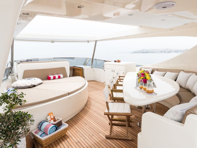 Beginnen Sie Ihre Reise mit einem Willkommensdrink am stilvollen Esstisch auf dem Achterdeck, der durch den Flybridge-Überhang wunderbar beschattet wird. Wenn Sie es nicht erwarten können, ein erfrischendes Bad zu nehmen, begeben Sie sich auf die breite Badeplattform, die Ihnen als Privatstrand in der türkisfarbenen See dienen kann. Daneben sind in der Garage zahlreiche Wasserspielzeuge untergebracht, darunter ein Sea-Bob, eine Skiausrüstung, ein Paddleboard und vieles mehr. Trocknen Sie sich auf dem riesigen Solarium auf dem Sonnendeck ab, wo Sie den Panoramablick genießen können, während Sie mit dem freundlichen Kapitän Stoyanov plaudern. Für köstliche Gerichte, die der talentierte Bordkoch zubereitet, nehmen Sie Platz am schicken Flybridge-Tisch, der für festliche Mahlzeiten wunderschön hergerichtet ist.