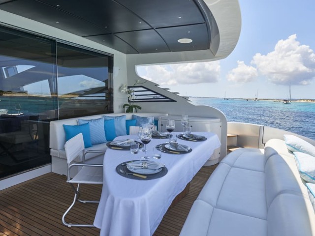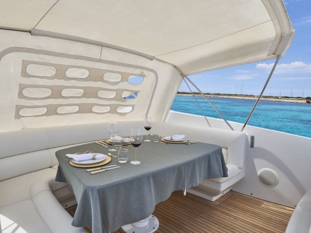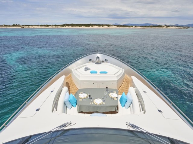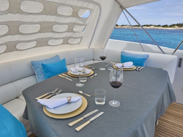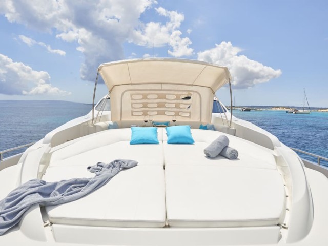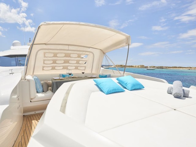 Más cerca de la proa, encontrará una mesa de comedor con un bimini extraíble que ofrece protección solar, así como otra amplia zona para tomar el sol que también puede servir como un hermoso lugar para los cócteles del atardecer o la reflexión de la mañana. Tómese el sol o pase las páginas de su novela favorita. Esta zona es simplemente un lugar para disfrutar de apasionantes aventuras en el mar a bordo de este super yate, Danzas.
