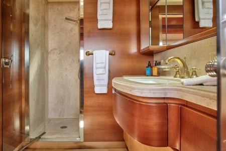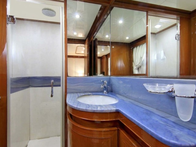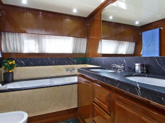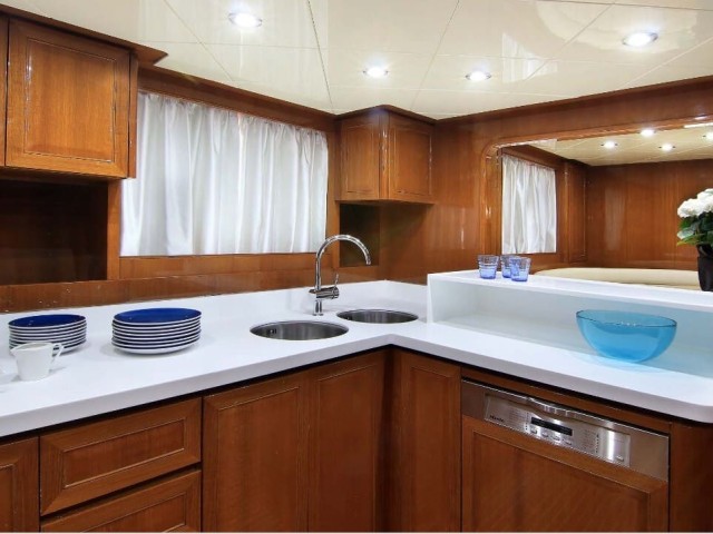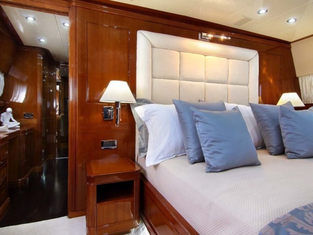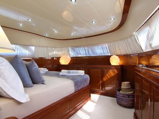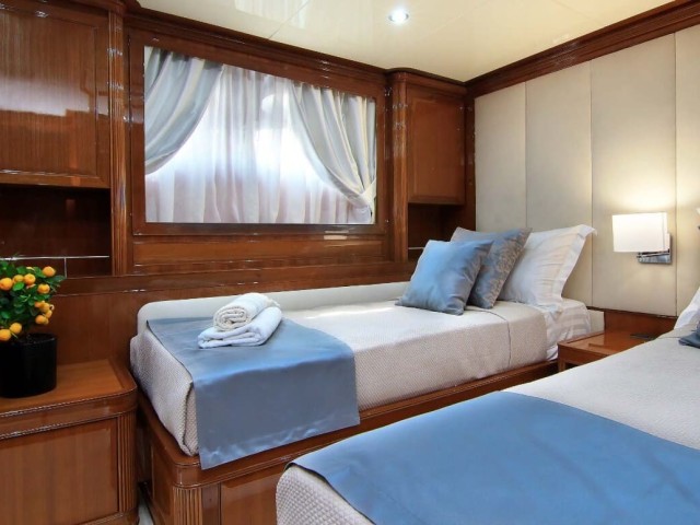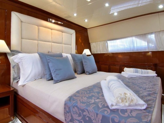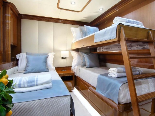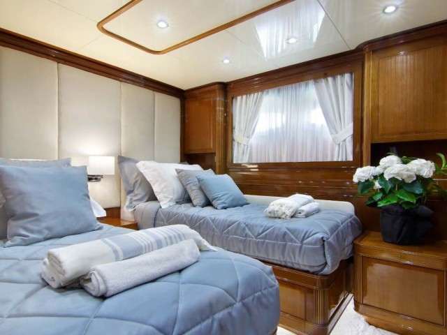 Elvi puede alojar hasta 11 invitados en cinco elegantes cabinas, ofreciendo comodidad y flexibilidad tanto para familias como para amigos. En la cubierta principal se encuentra la espaciosa suite del armador, que cuenta con una cama king-size, un baño privado y una Smart TV plegable de 50 pulgadas para disfrutar de la máxima relajación. En la cubierta inferior, dos cabinas VIP con camas tamaño queen pueden conectarse mediante una puerta contigua para crear una suite más amplia, mientras que dos cabinas twin ofrecen configuraciones flexibles, una de ellas con una cama Pullman adicional y la otra convertible en una cama doble, ideal para parejas o hasta tres niños. Todas las cabinas cuentan con baños en suite y Smart TVs para mayor comodidad.