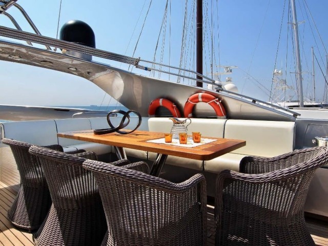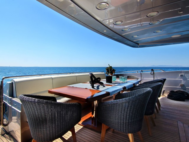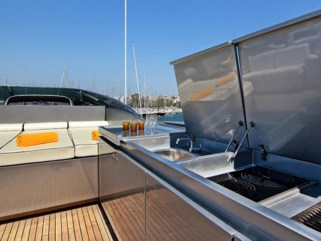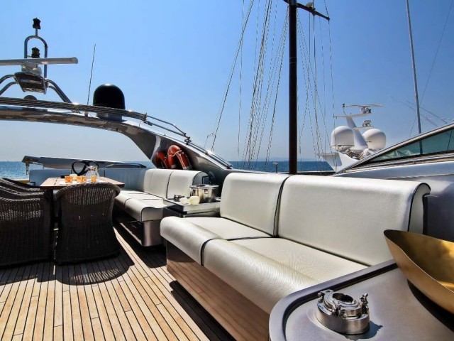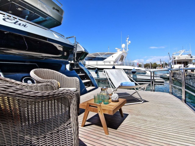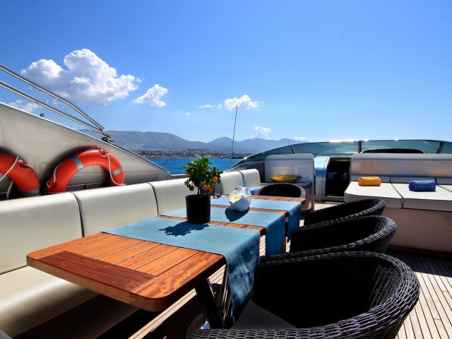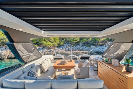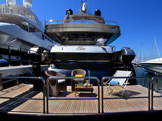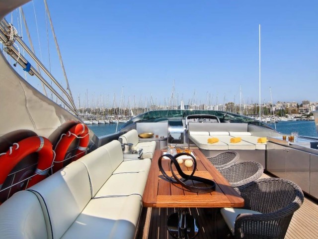 Diseñado para disfrutar del exterior, Elvi cuenta con generosos espacios exteriores ideales para tomar el sol y socializar. La amplia cubierta trasera ofrece áreas sombreadas para cenar al aire libre y relajarse, mientras que la proa y el flybridge son perfectos para disfrutar del sol mediterráneo. Para quienes prefieren la sombra, se pueden desplegar toldos para garantizar el confort durante los días más calurosos.