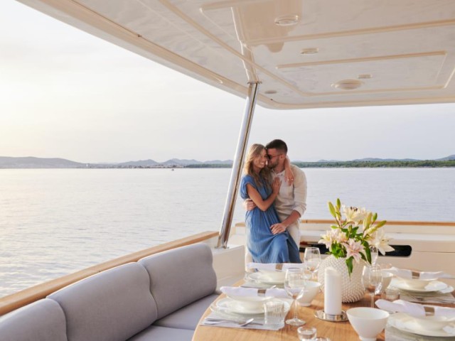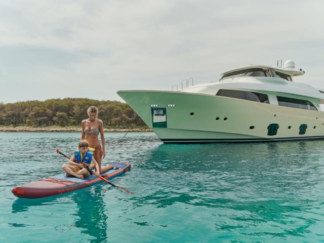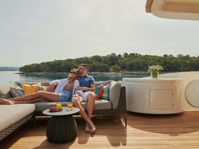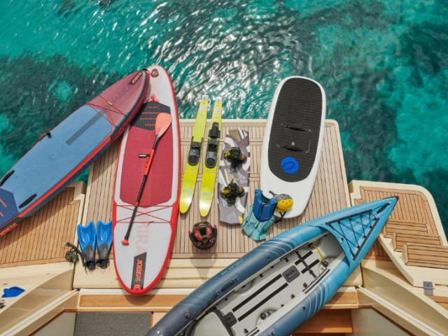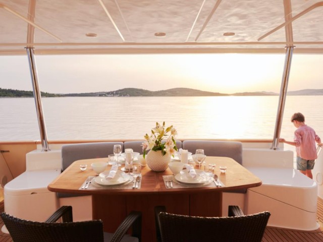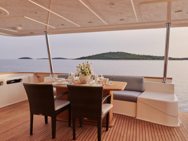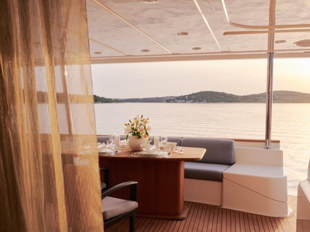 La mesa de asientos de la cubierta de popa ofrece más sombra y un rápido acceso a la amplia plataforma de baño que le servirá de playa privada en las calas más bellas del Adriático. En el garaje se guarda una amplia lista de juguetes acuáticos, siempre a su disposición cuando le apetezca darse un baño con adrenalina.