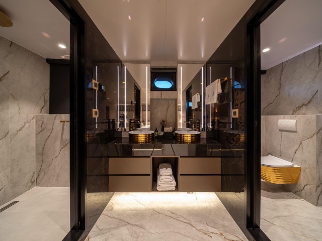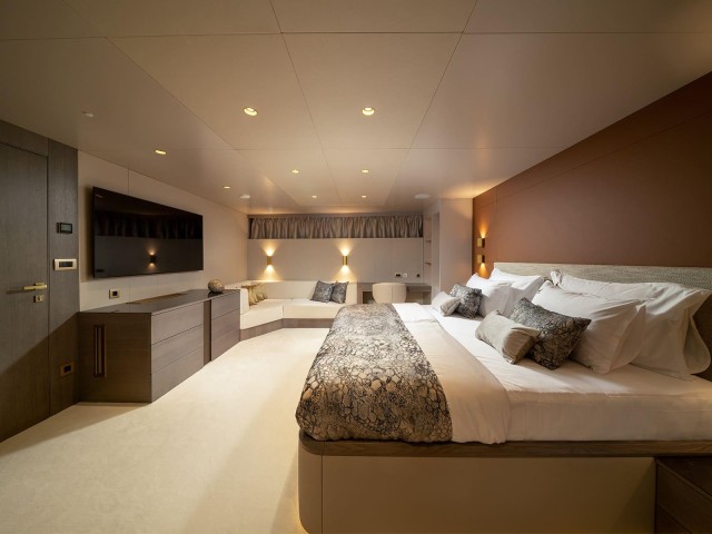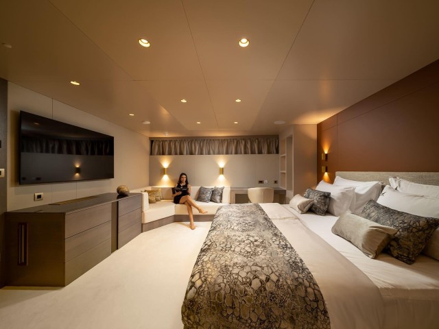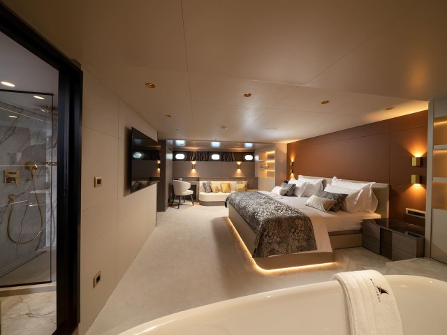 Nocturno ofrece una impresionante variedad de alojamientos, incluyendo una espaciosa Master Suite con cama king-size y bañera de hidromasaje privada, y una igualmente generosa VIP Suite con baño en-suite. Además, dos camarotes dobles con cama de matrimonio y dos camarotes twin convertibles con opción de cama de matrimonio garantizan flexibilidad y comodidad para todos. Todos los camarotes están equipados con armario, caja fuerte, cuarto de baño privado con artículos de aseo de primera calidad, así como dispositivos de entretenimiento como TV, sonido envolvente y WiFi.