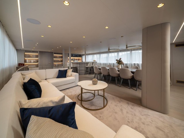 El salón de la cubierta principal ofrece un ambiente elegante y espacioso con una zona de comedor y un salón, donde los invitados pueden relajarse y disfrutar de juegos de mesa o conversar. Su diseño moderno y ambiente acogedor lo hacen ideal para reuniones, mientras que las grandes ventanas ofrecen una abundancia de luz natural y vistas de los impresionantes alrededores.