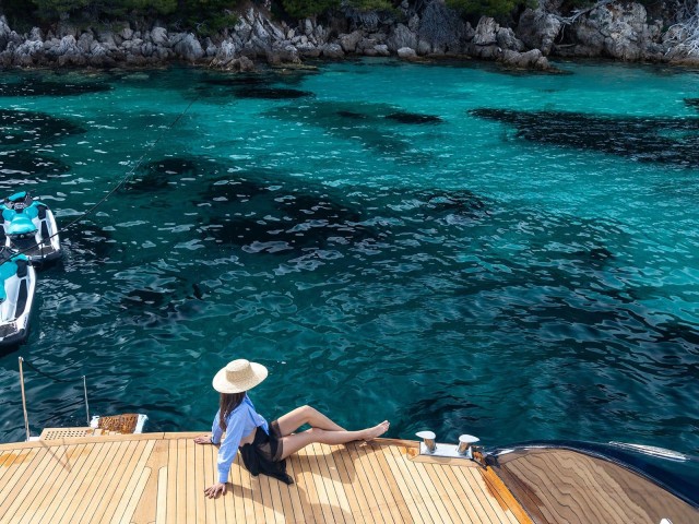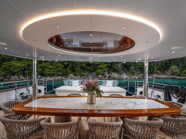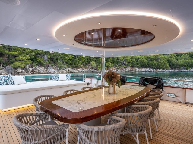 Diseñados para socializar y relajarse, los espacios exteriores son inigualables. La cubierta principal cuenta con una zona de comedor al aire libre, perfecta para disfrutar de comidas al aire libre. En el flybridge, los invitados pueden relajarse en el jacuzzi rodeado de tumbonas y una zona de estar con bar y asientos adicionales. Este espacio elevado es ideal para tomar el sol, tomar un cóctel por la noche o contemplar las estrellas.