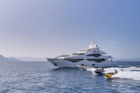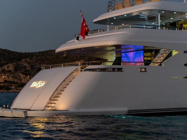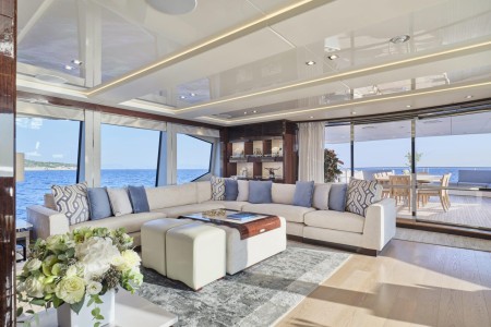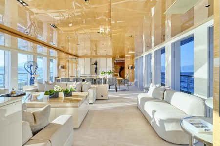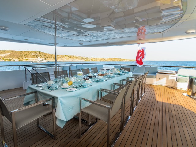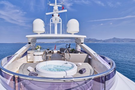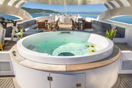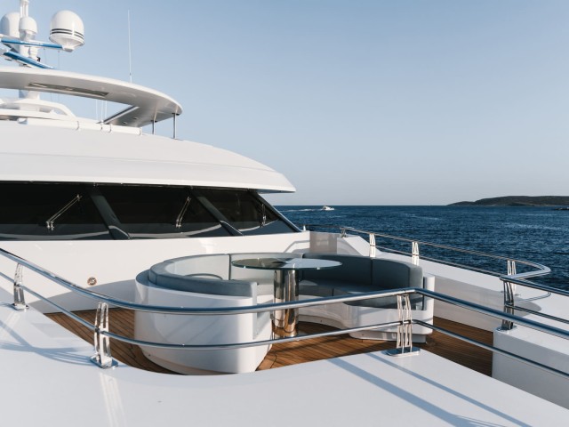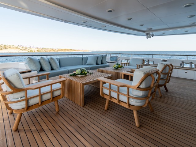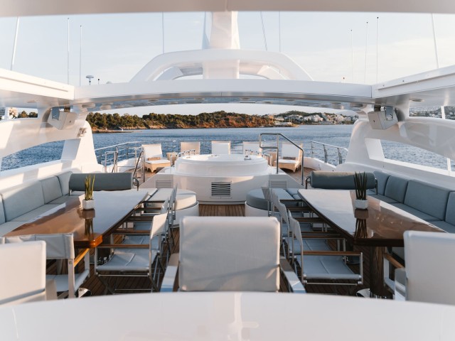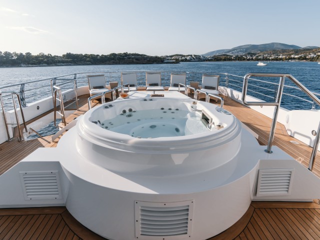 Los exteriores de Vertigo son igualmente impresionantes. El amplio solárium, el más grande de su clase, incluye una piscina climatizada de vidrio doble con vistas despejadas al mar. Los invitados pueden disfrutar de cenas al aire libre, tomar el sol o relajarse en las cómodas áreas de descanso mientras admiran el impresionante paisaje de las islas griegas. La amplia plataforma de baño facilita el acceso al agua para nadar o practicar deportes acuáticos.