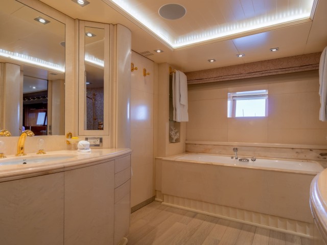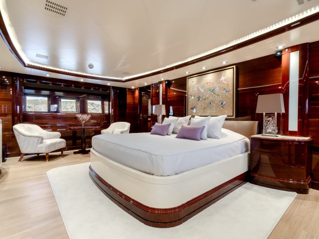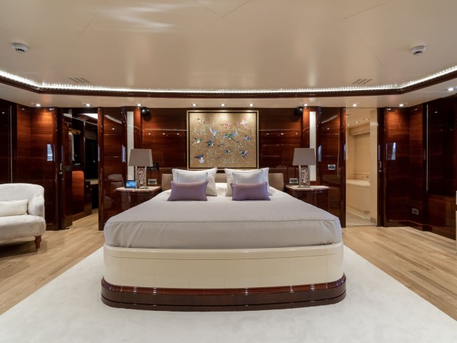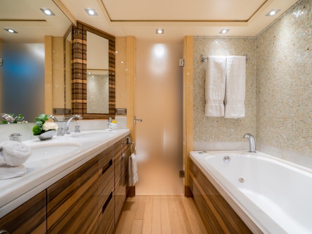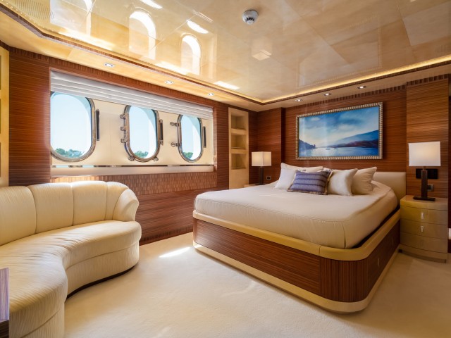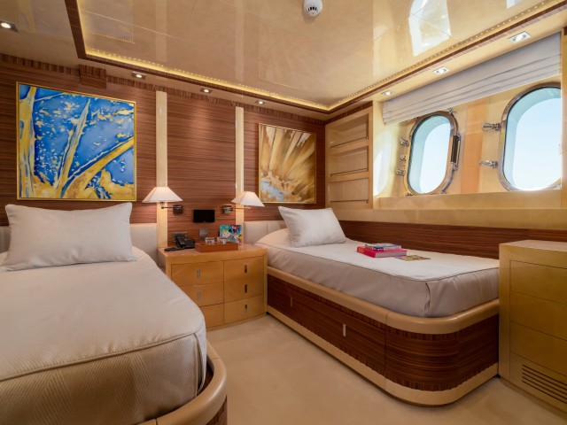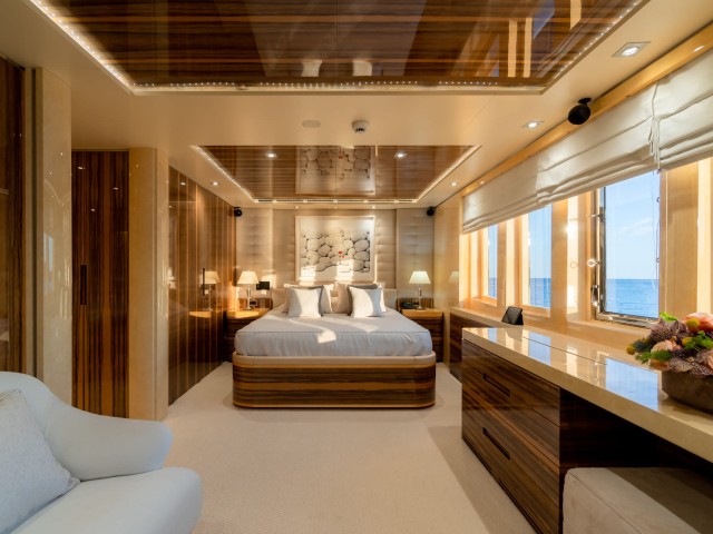 Vertigo acomoda hasta 12 invitados en siete espaciosos y lujosos camarotes. En la cubierta principal, la suite del propietario ocupa toda la manga del yate y cuenta con una cama king-size, vestidor y un lujoso baño privado con jacuzzi y ducha. También en la cubierta principal se encuentra una cabina twin con baño privado y una litera Pullman adicional, ideal para familias o niños.