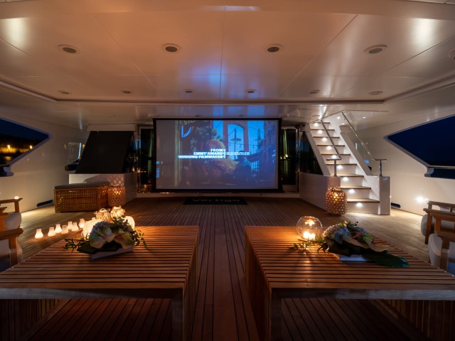 Vertigo está equipada con un moderno sistema multimedia Crestron, Apple TV en todas las áreas y televisión satelital sin zonas de sombra, garantizando una experiencia de entretenimiento de primera clase. Los amantes del fitness pueden disfrutar de equipos Technogym, colchonetas de yoga y amplios espacios para entrenar en la cubierta.