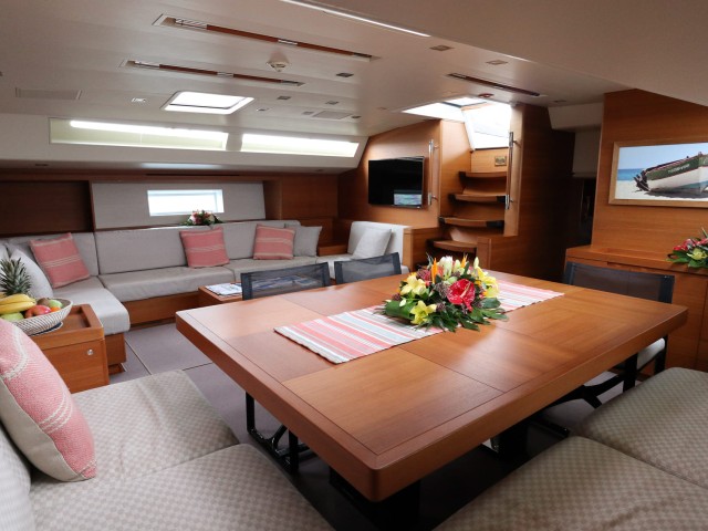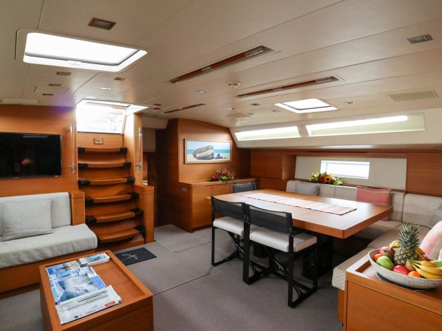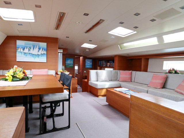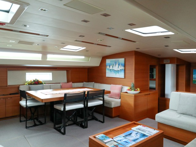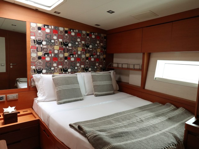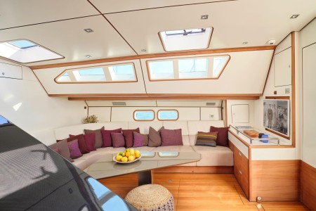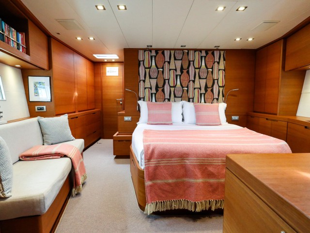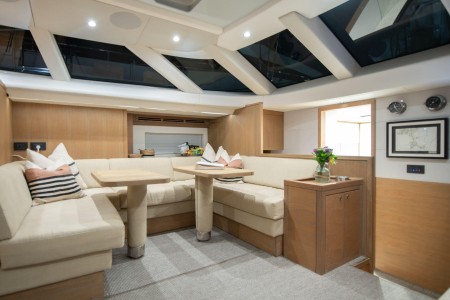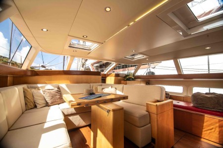 Inside, Freebird features a wide, full-beam main saloon designed for social gatherings and relaxing in comfort. On the port side, a plush lounge area invites guests to unwind, while to starboard a large dining table comfortably seats up to eight. The layout has been carefully arranged to provide excellent separation between the guest and crew quarters.