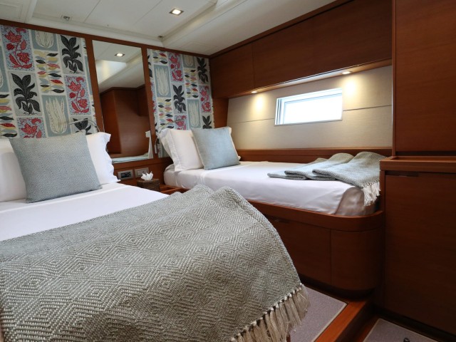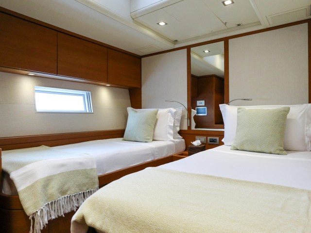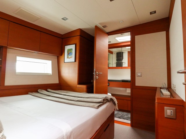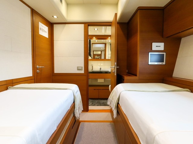 Freebird accommodates up to eight guests across four stylish staterooms. Forward, the master suite is positioned in the quietest part of the yacht and includes a queen-sized bed, a private sofa for two, a vanity desk, and a spacious en suite bathroom with a shower. Just aft is the VIP cabin, also offering a double bed and private bathroom. Two twin cabins, located toward the rear of the yacht, provide additional flexibility and are ideal for families or groups of friends. All cabins are tastefully appointed, combining light finishes with elegant detailing.