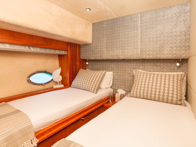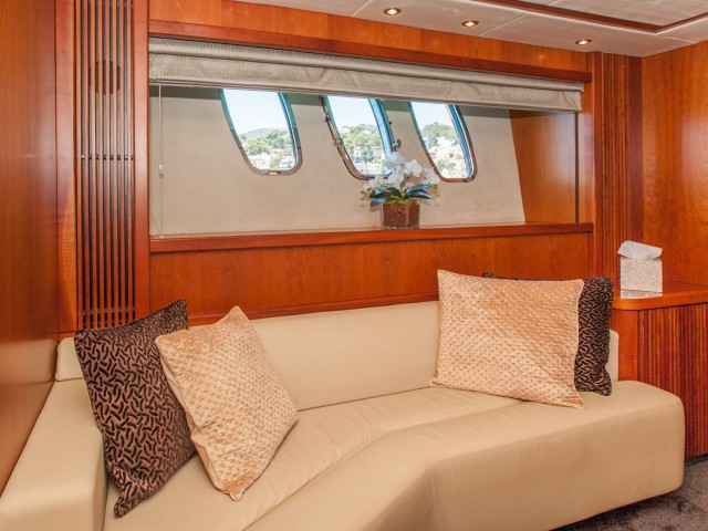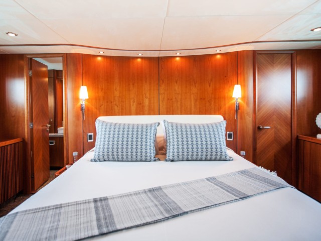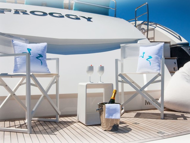 The first thing you’ll notice as you embark will be her stunning aft deck, where you’ll find a big dining table for indulging in mouth-watering cuisine prepared by the skilled chef. Closer to the stern, there’s a sunbathing area ideal for an after-lunch siesta. If you take the stairs, you’ll reach the bathing platform, so wide, it practically serves as a sea-level deck. Froggy has a garage full of exciting water toys that will entertain all guests. After some vigorous activity, you’ll probably want to rest and dry off - take the lateral walkways to reach the bronzing oasis at the bow, where you can work on your tan and enjoy endless blue vistas.