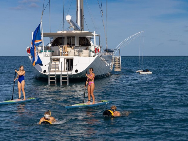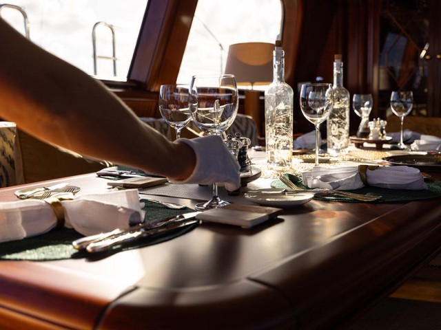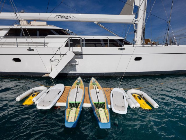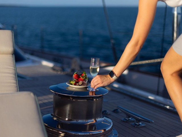 For those who wish to stay connected, Hyperion is equipped with Starlink internet, ensuring reliable connectivity even in remote anchorages. Entertainment is a central part of life on board, with a Seascape stereo music system across nine independent zones, over 800 movies available via a computer touch system, and 42-inch and 20-inch screens in the saloon and guest cabins respectively. From tranquil relaxation to lively evenings, every atmosphere is at your fingertips.