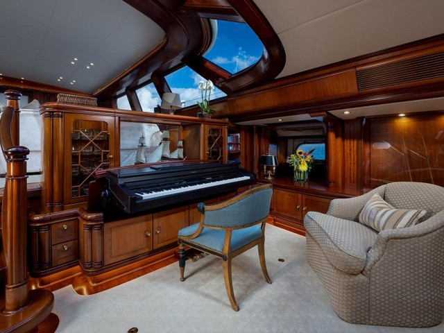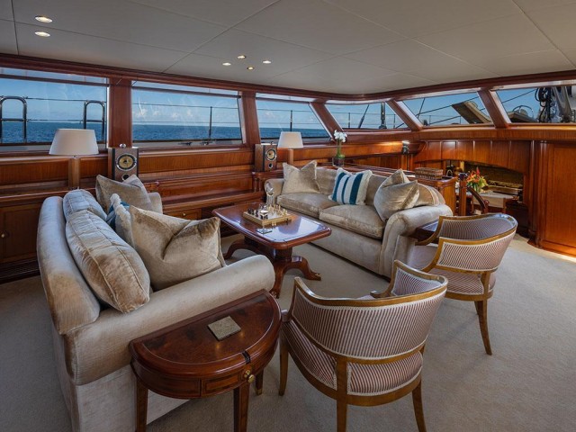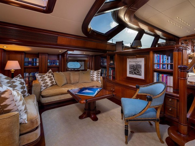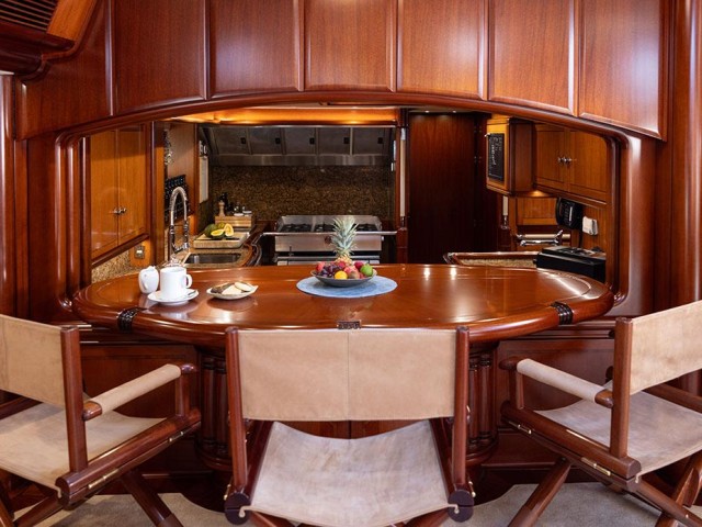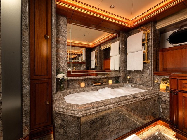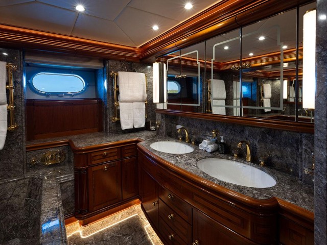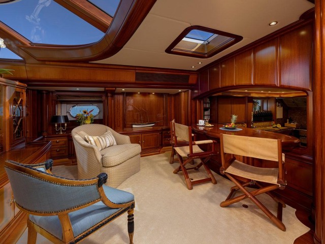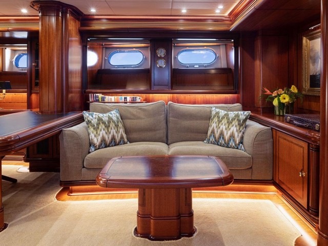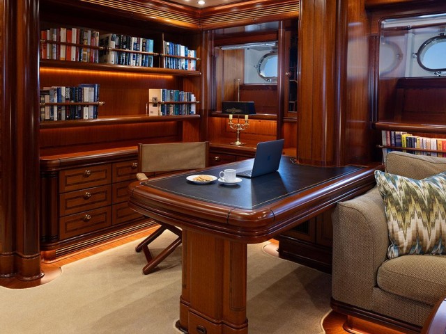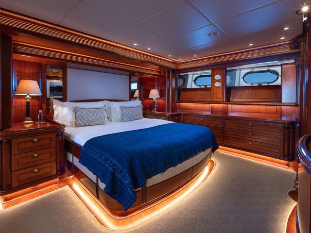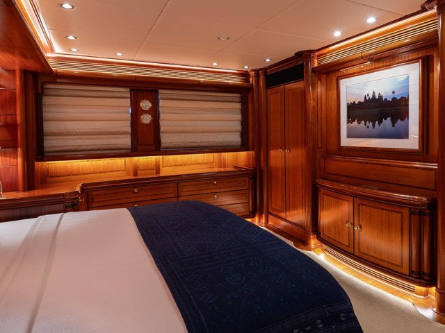 Guests are accommodated in three beautifully appointed cabins, all located aft. The full-beam master suite is a private retreat, complete with a king-size bed, generous study area, and luxurious en-suite bathroom. A starboard VIP cabin offers a queen-size bed and en-suite, while the twin cabin to port features two single beds and its own en-suite bathroom. Each cabin is equipped with private entertainment systems, rich wood detailing, and plush bedding to ensure restful nights at sea.
