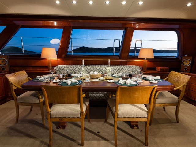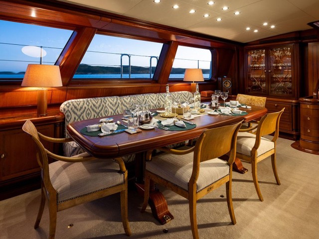Hyperion welcomes guests into an expansive, light-filled salon, designed with modern elegance and enhanced by plush furnishings, warm wood finishes, and panoramic windows. Whether enjoying a gourmet meal at the formal dining table, relaxing with a glass of wine from the 200-bottle temperature-controlled cellar, or watching a movie on the large screen in the saloon, the interior spaces offer both sophistication and comfort.