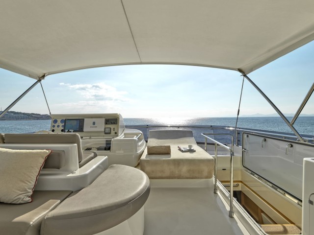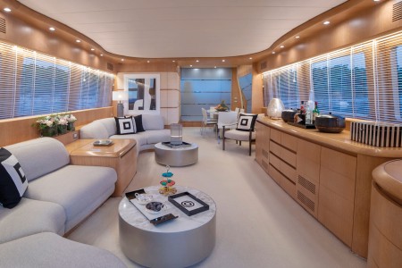 The aft deck area boasts an elegant seating table where you can surrender to the delicious gastronomic delicacies prepared by the onboard chef. The sliding door will take you to the chic salon, where you can enjoy family bonding time in a chic environment of harmonic neutral tones. With state of the art technology, including a SONOS sound system, you can enjoy a great cinema experience or choose your favorite tunes for fun soirees onboard.