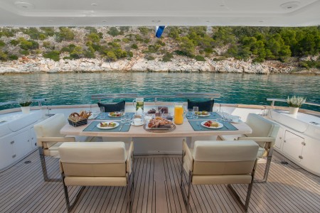 For a restful night at anchor, 8 guests can choose between 4 luxurious cabins, beautifully decorated to satisfy the tastes of even the most demanding yachtsmen. The master suite is a spacious oasis where you can wake up to panoramic views, as it has full-length windows that use the gorgeous views as additional decor. A spacious VIP suite flaunts a chic ambiance, while one of the two twin cabins can be converted into a double upon request. All cabins are equipped with ensuites to ensure maximum privacy for all guests.
