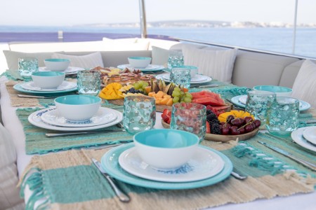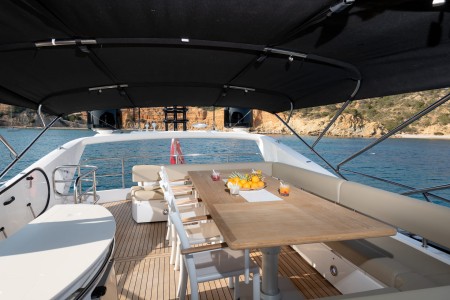 The aft deck has a large circular dining table where you can enjoy gourmet cuisine while surrounded by the infinite blue sea. A gracious sunbed is fitted to the stern and offers optional shade with a retractable bimini. The cushioned solarium at the foredeck is the perfect spot to laze around while cooled by the gentle breeze as Nina cuts smoothly into the waves. Exterior led lights and underwater stern lights create a romantic atmosphere for champagne-fused soirees that will stay engraved in your memory long after your yacht charter vacation is over.