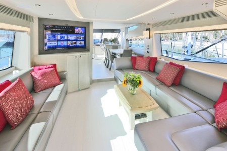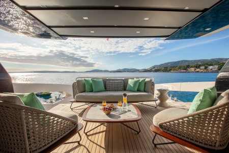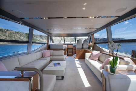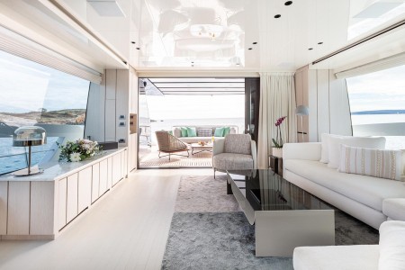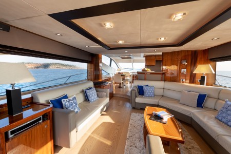 The awe-inspiring salon allows an abundance of light through creative wrap-around windows and glass sliding doors that beautifully illuminates her sophisticated decor of premium natural woods and beige textile. The open style living space allows you to enjoy dining and lounging in style while enjoying panoramic views on your journey.