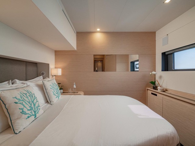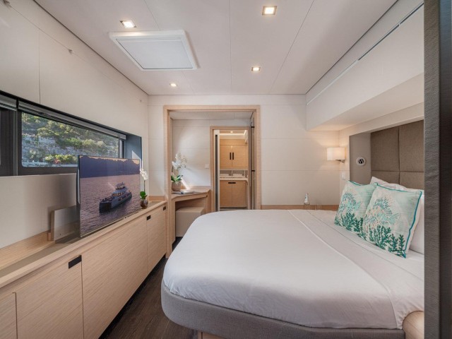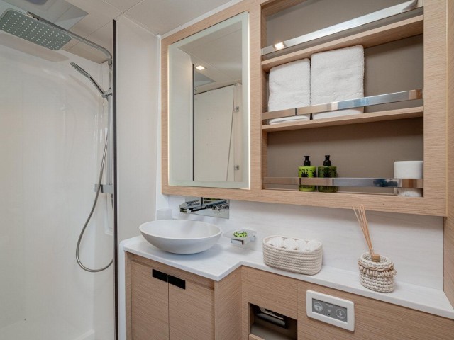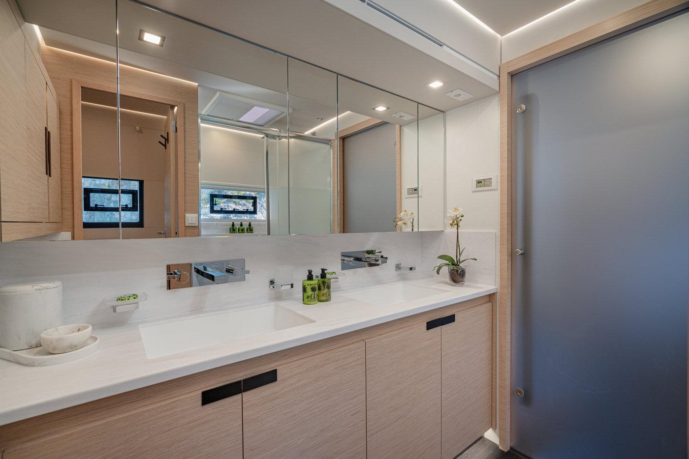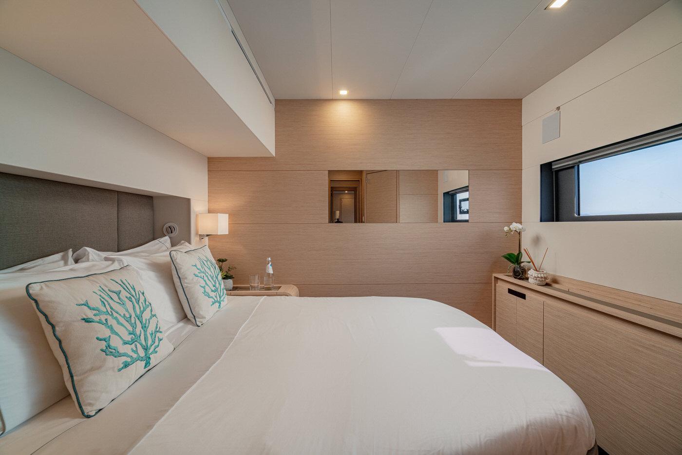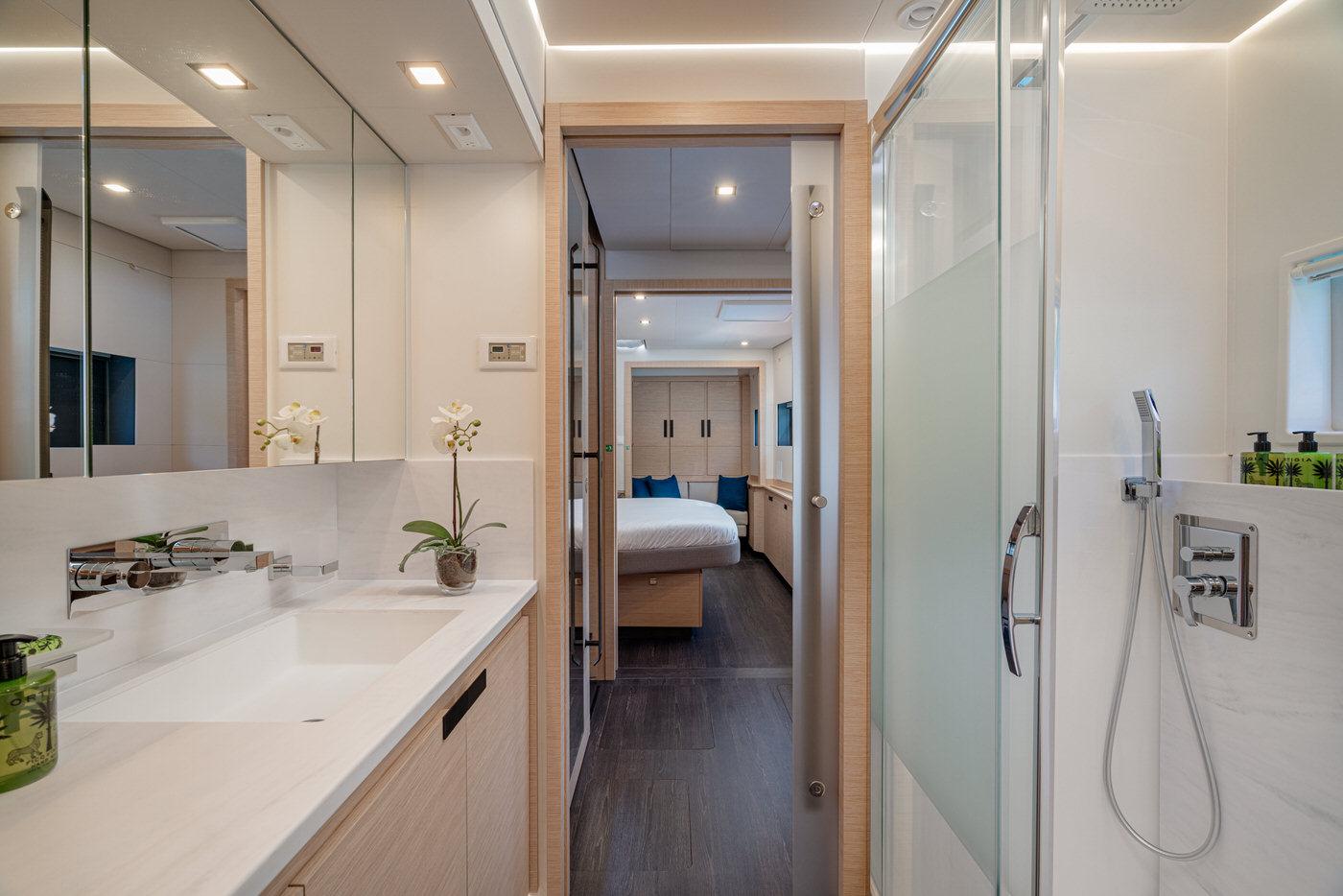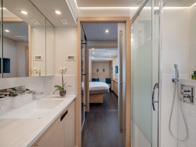 CORE accommodates up to eight guests in four beautifully arranged double cabins, each with its own private en-suite bathroom. The owner’s cabin is particularly generous and offers a stylish and peaceful retreat after a day exploring the coast. A further VIP double cabin and two additional double cabins complete the layout, making the yacht very well suited to couples, families with older children, or a group of friends travelling together.