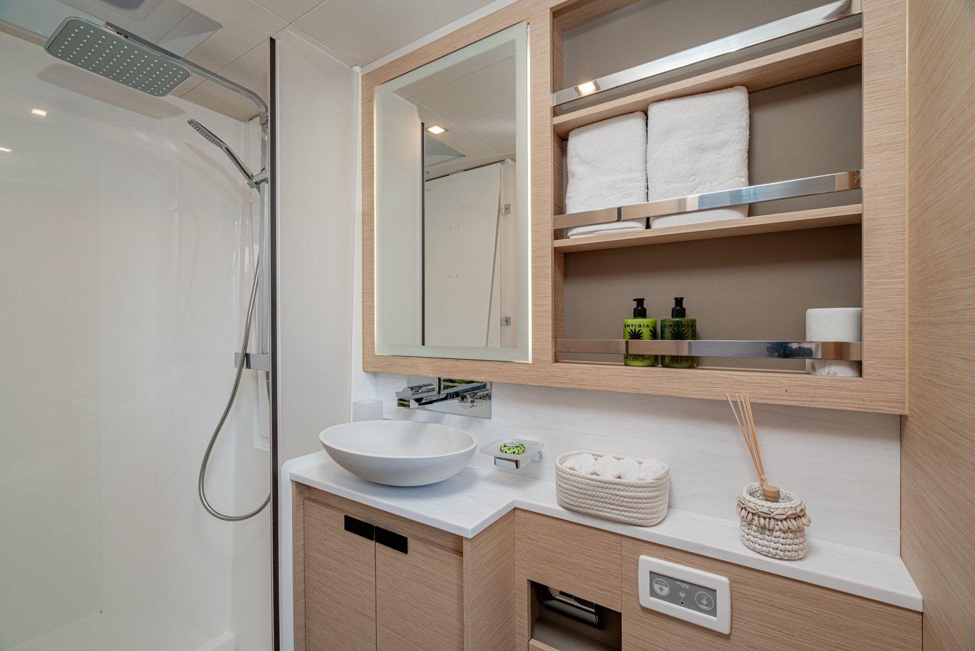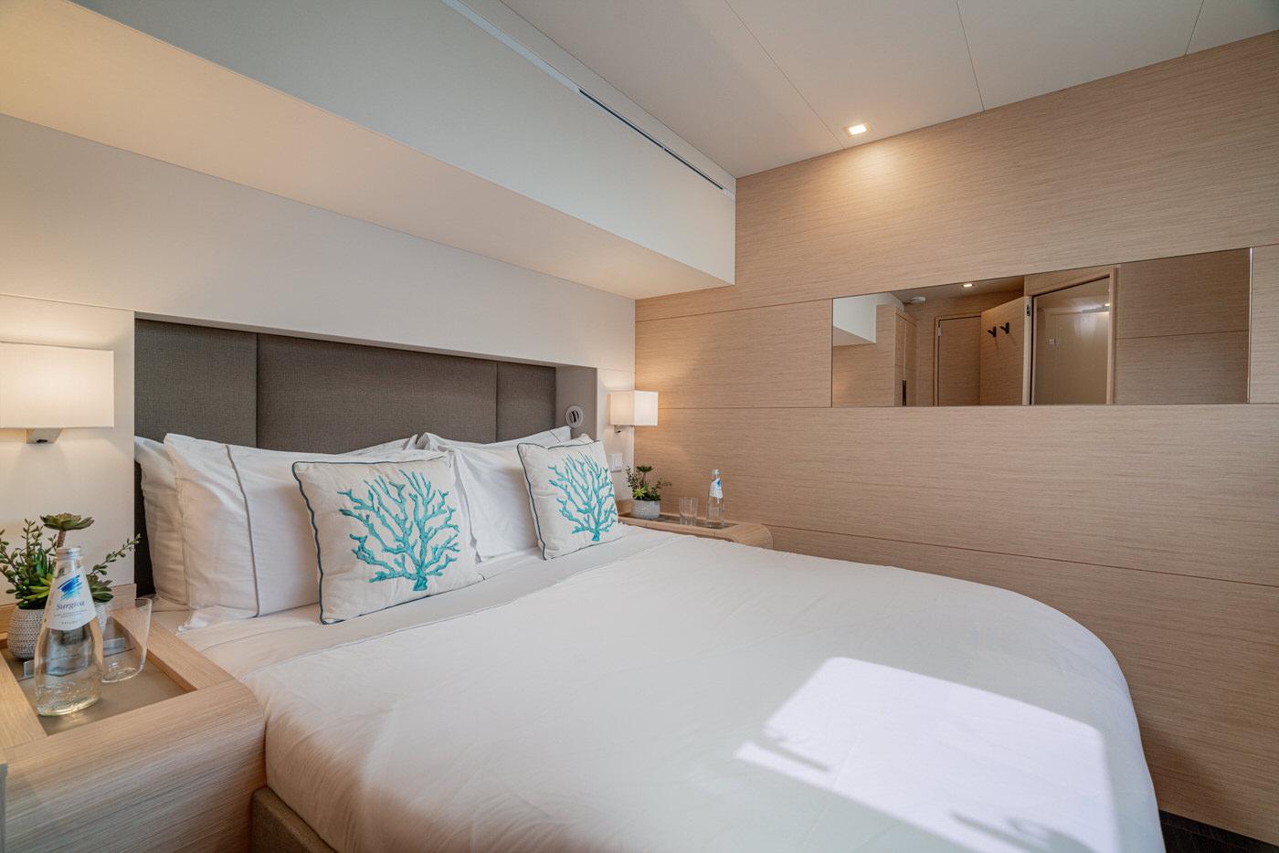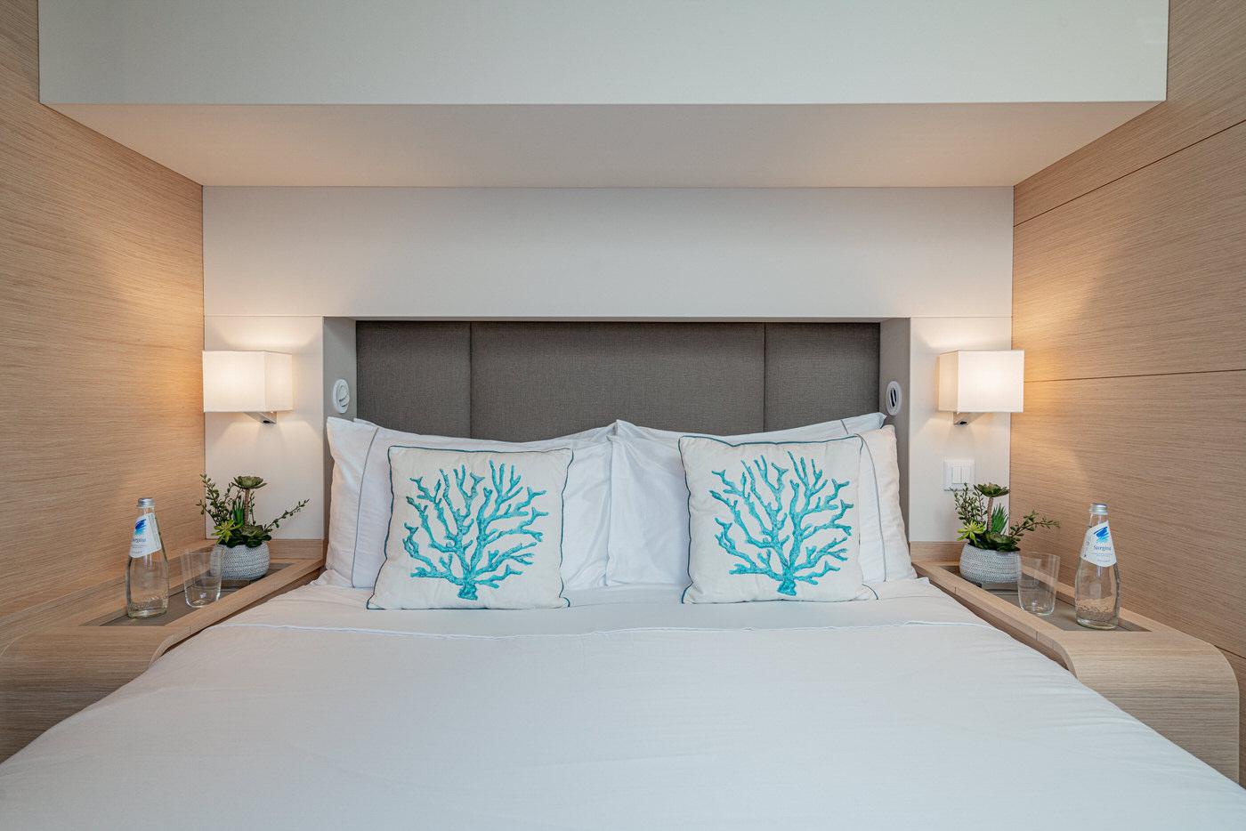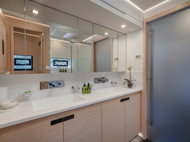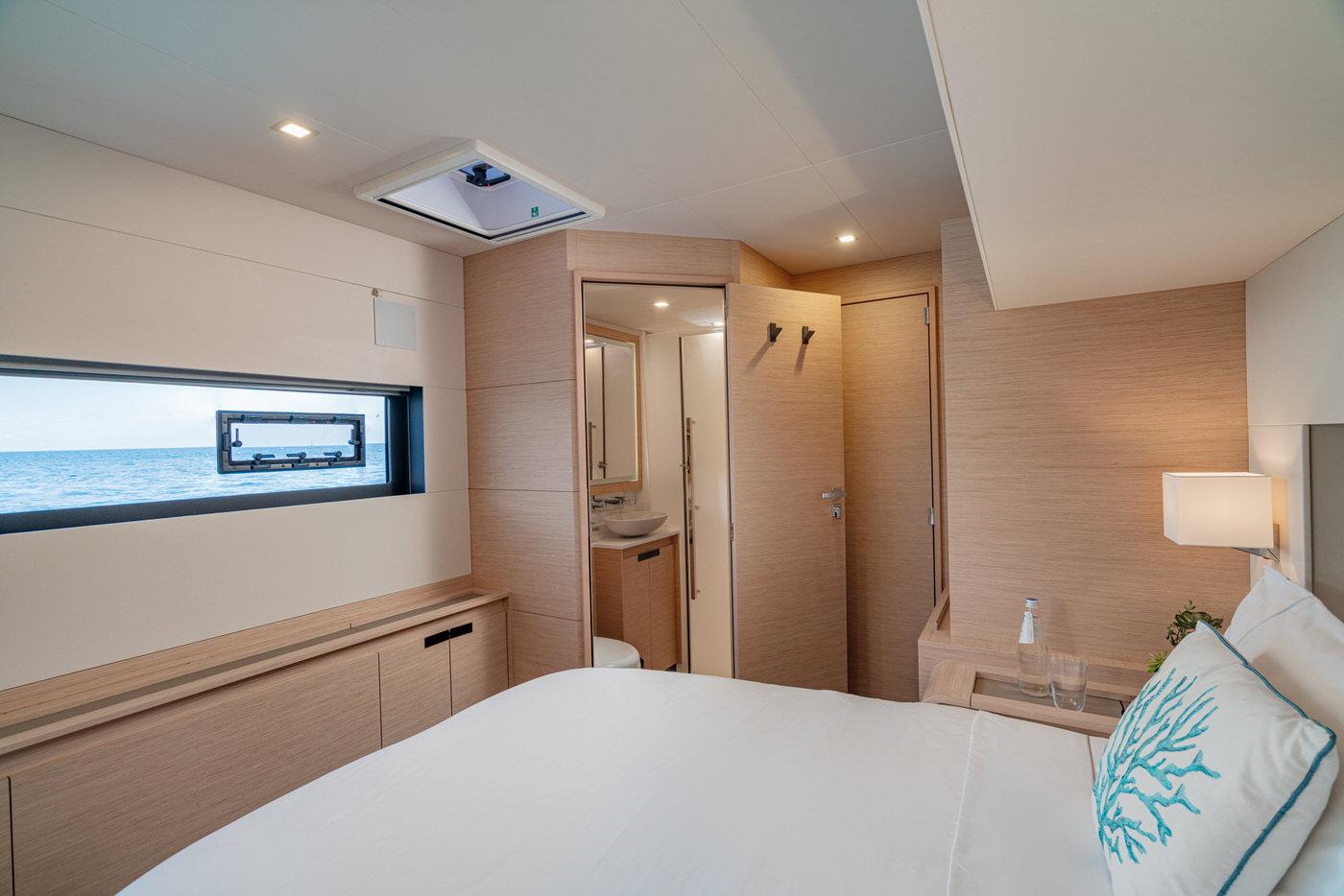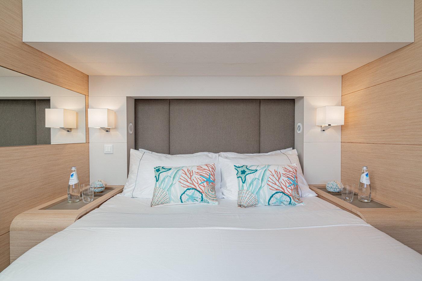 CORE accommodates up to eight guests in four beautifully arranged double cabins, each with its own private en-suite bathroom. The owner’s cabin is particularly generous and offers a stylish and peaceful retreat after a day exploring the coast. A further VIP double cabin and two additional double cabins complete the layout, making the yacht very well suited to couples, families with older children, or a group of friends travelling together.