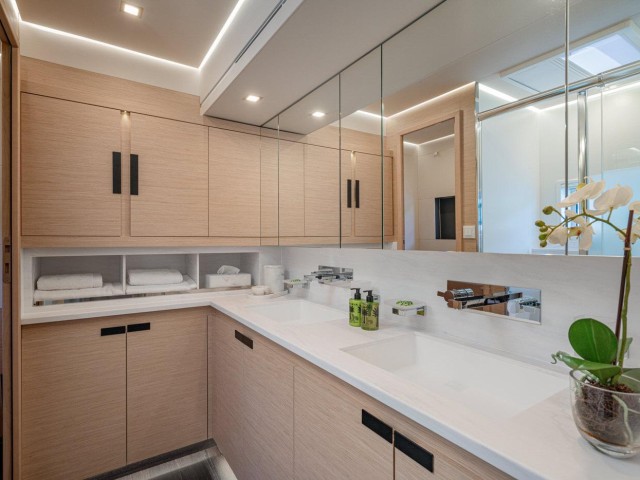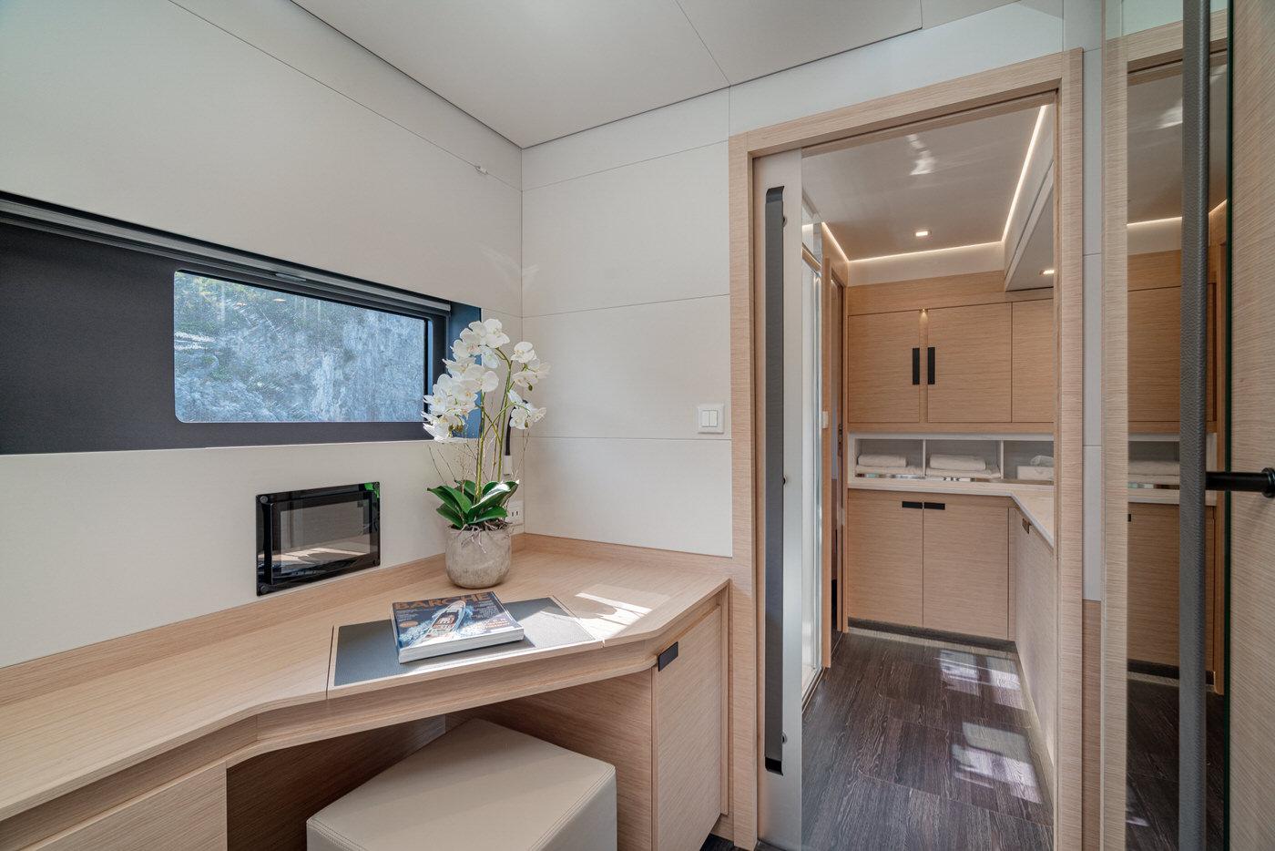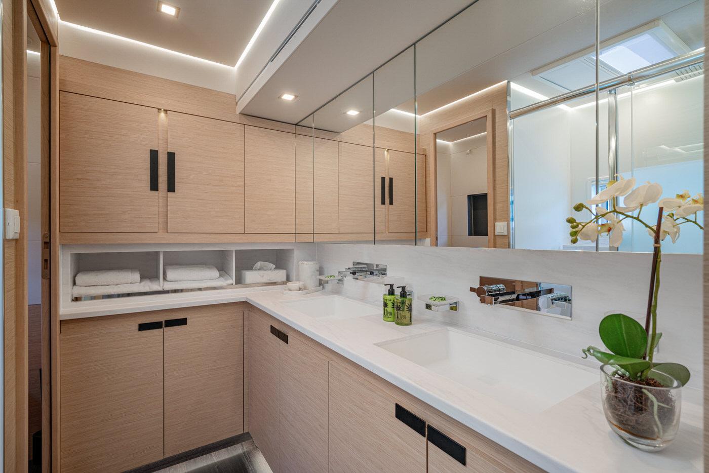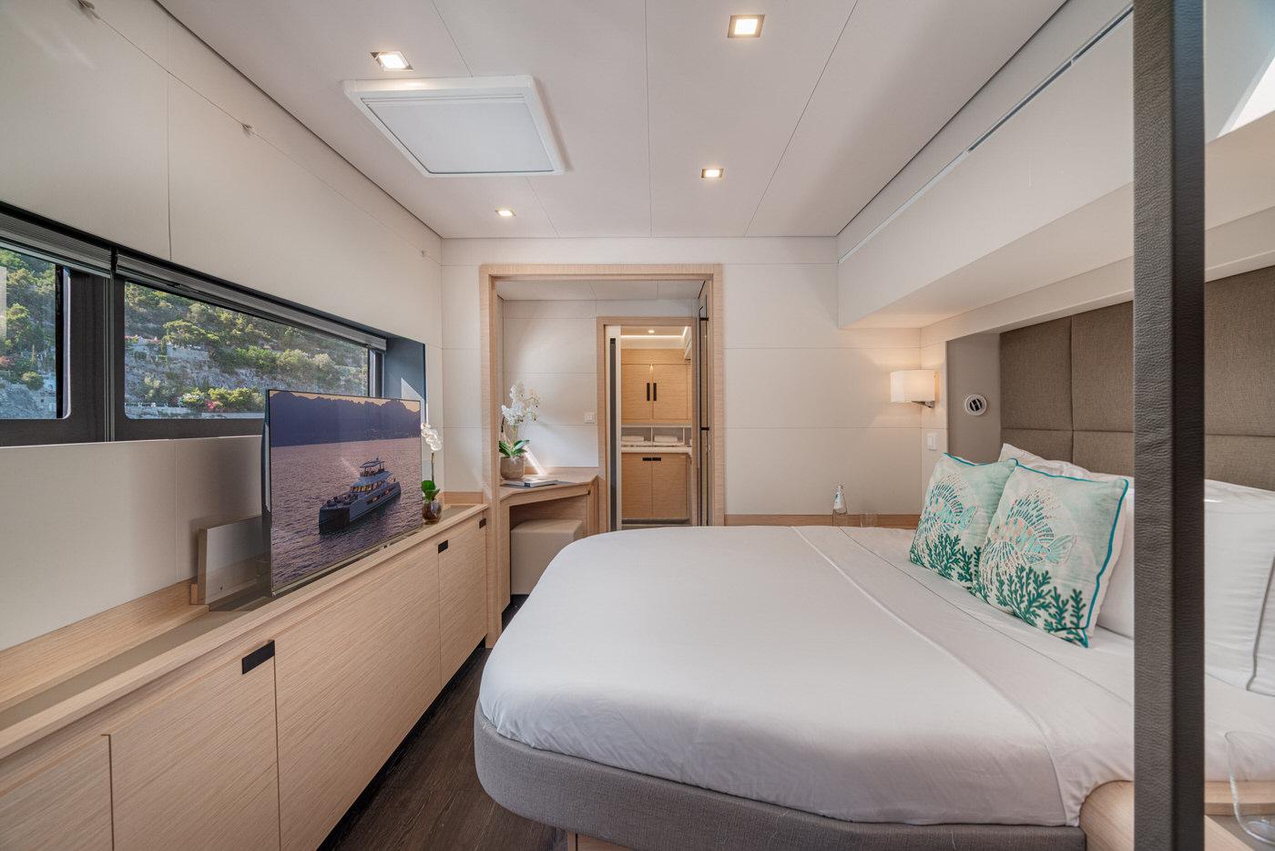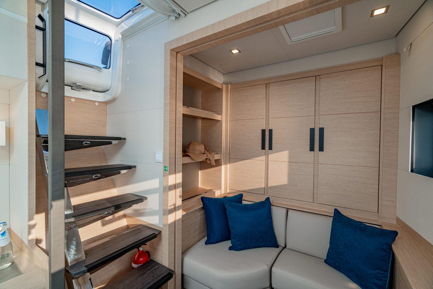 CORE accommodates up to eight guests in four beautifully arranged double cabins, each with its own private en-suite bathroom. The owner’s cabin is particularly generous and offers a stylish and peaceful retreat after a day exploring the coast. A further VIP double cabin and two additional double cabins complete the layout, making the yacht very well suited to couples, families with older children, or a group of friends travelling together.