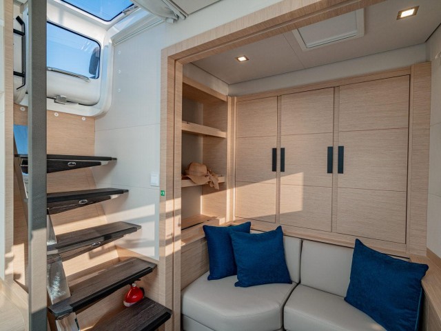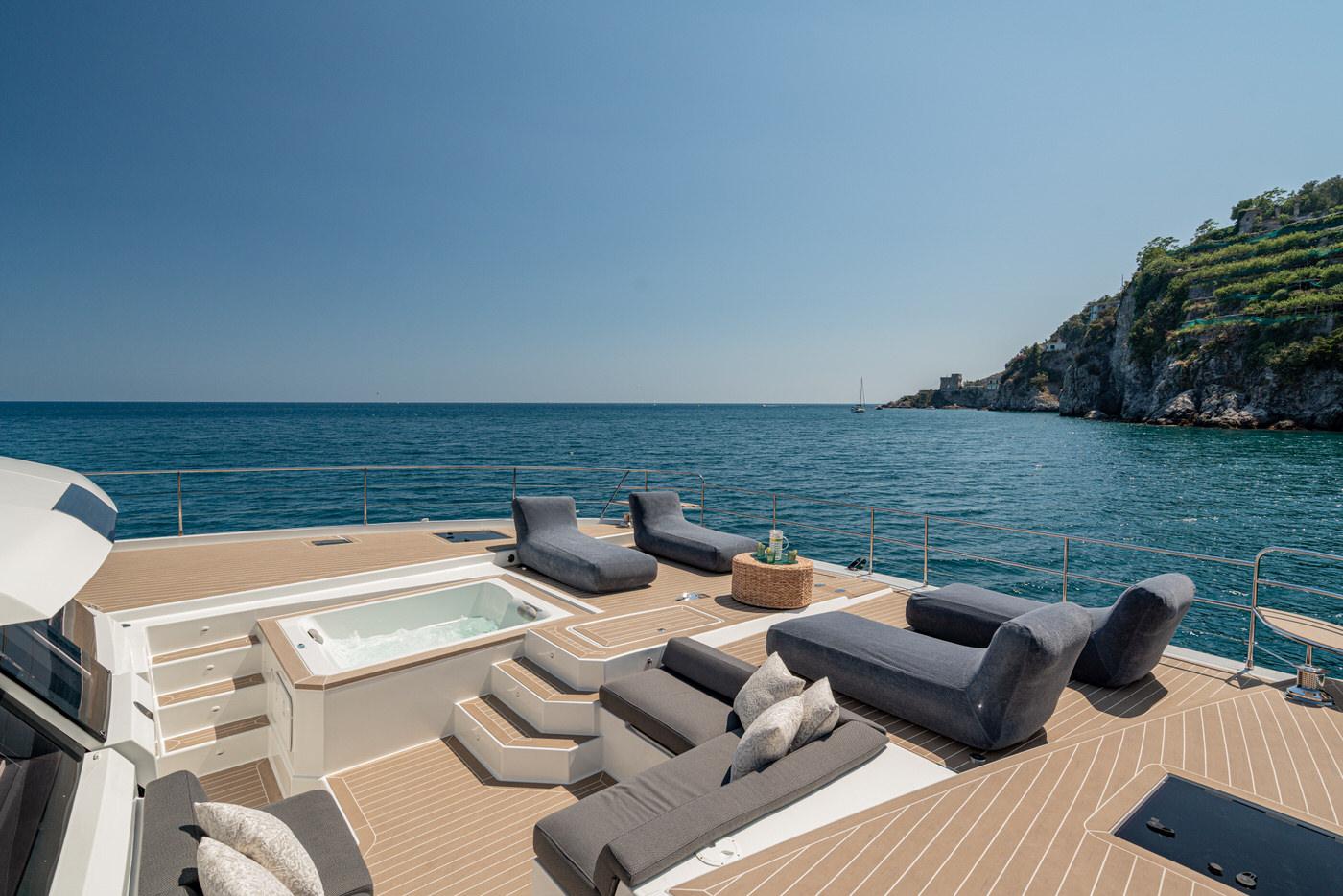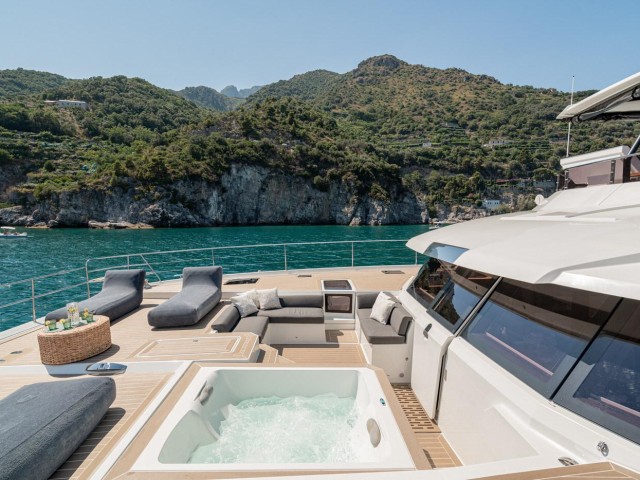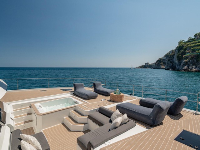 Up on the flybridge, panoramic views create the perfect backdrop for sunset cocktails or quiet cruising between destinations. This elevated space is one of the yacht’s highlights, offering both comfort and a sense of occasion. Forward, the deck becomes a private wellness area with a Jacuzzi where guests can unwind while enjoying the surrounding scenery.