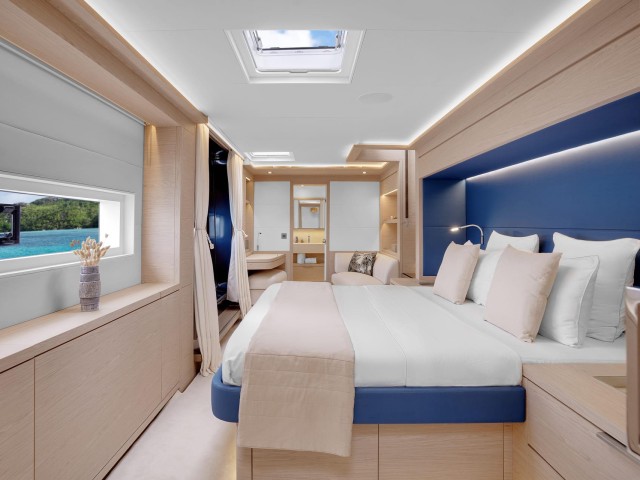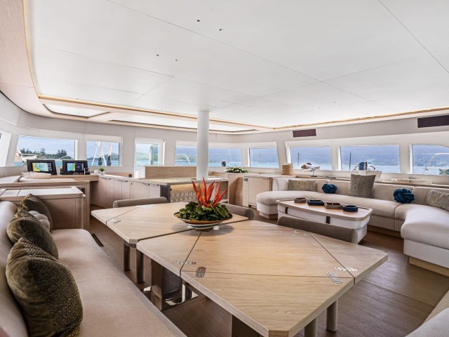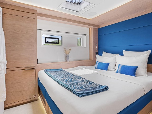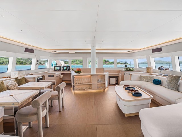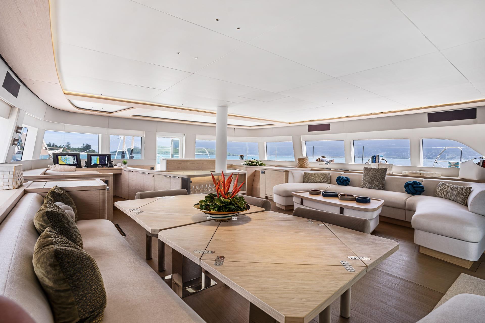 Forward, the signature Lagoon trampolines and lounging areas offer a unique place to unwind, while the flybridge creates a more elevated setting with comfortable seating, dining space and open views across the surroundings.