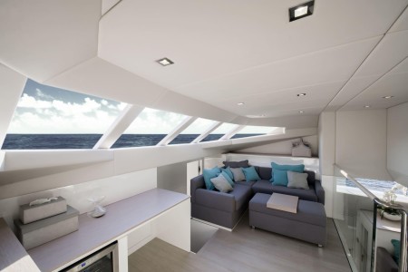 The interior of the spectacular Catamaran Moondance brings the experience of marine living to a whole new level. The salon is uncompromisingly modern and gleams in crisp white and icy hues, with nothing redundant to interfere with the ultramarine views coming from the unique windows. The open style galley allows you to watch the talented onboard chef work his magic - learn a few tricks to impress friends and family back home. Another indoor lounge is located in the enclosed flybridge area, where you can get the best panoramic vistas while unwinding in on the chic sofas and. The 42” inch TV allows you to use the skylounge as your private cinema room, and thanks to high speed WiFI, you can choose any film you want.