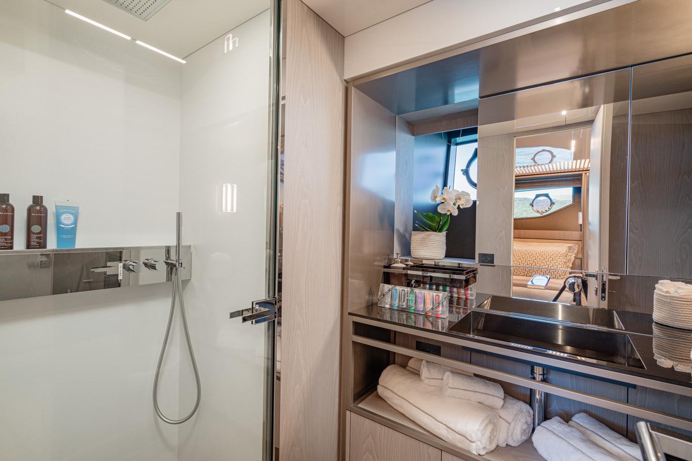 E3 bietet vier wunderschön gestaltete Kabinen, die den Bedürfnissen ihrer Gäste gerecht werden. Die vollflächige Masterkabine ist ein Ort der absoluten Luxusklasse und verfügt über ein privates Arbeitszimmer, einen großzügigen Kleiderschrank und ein eigenes Badezimmer. Zwei VIP-Kabinen mit Doppelbetten und eine Zweibettkabine bieten gleichermaßen geräumige und stilvolle Unterkünfte, die alle über eigene Badezimmer verfügen, um Komfort und Privatsphäre zu garantieren.